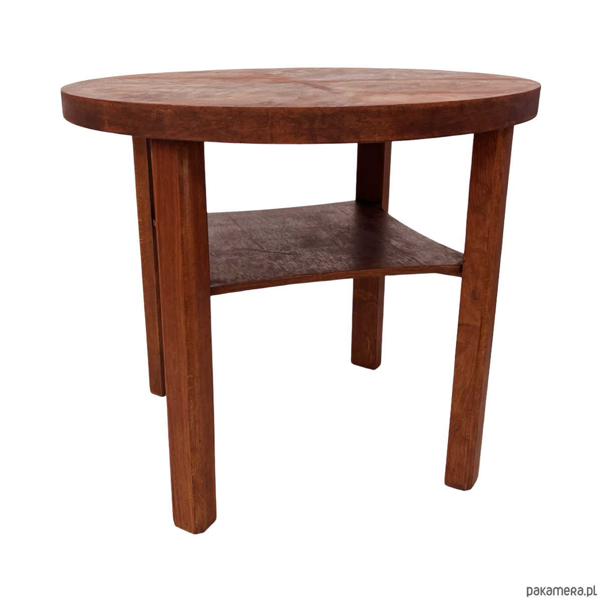 Stolik przeszedł pełną renowację – został oczyszczony, odświeżony i zabezpieczony olejem oraz politurą satynową, co podkreśla naturalne usłojenie i daje przyjemne, półmatowe wykończenie.