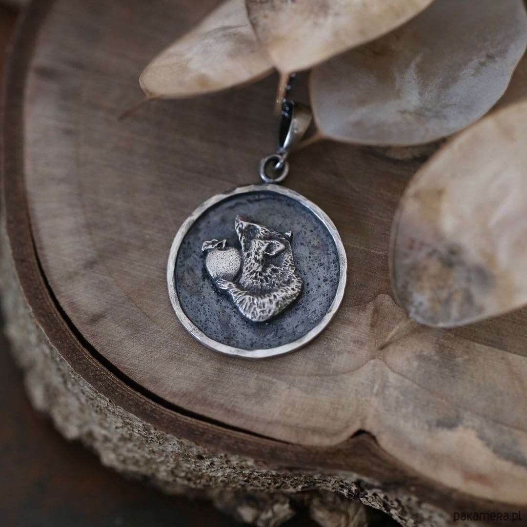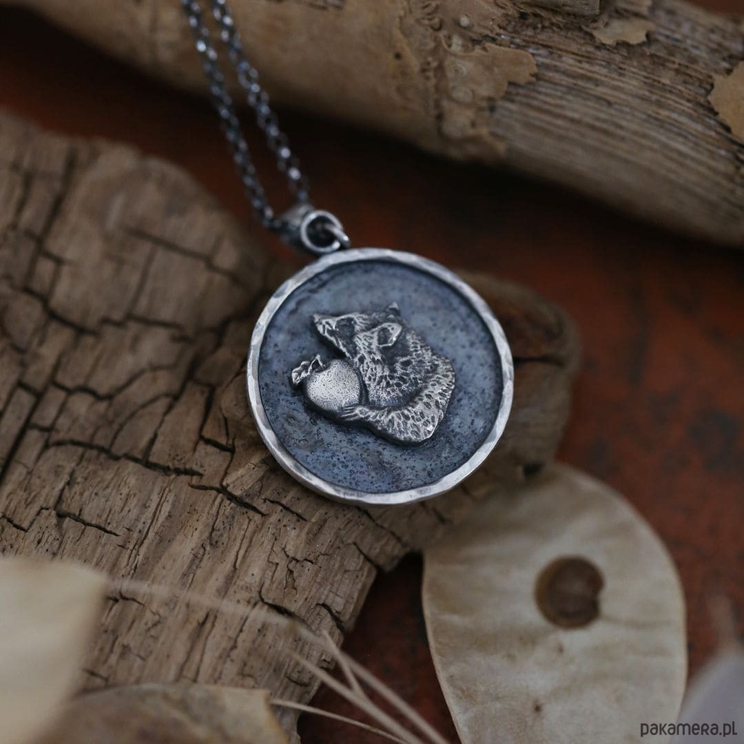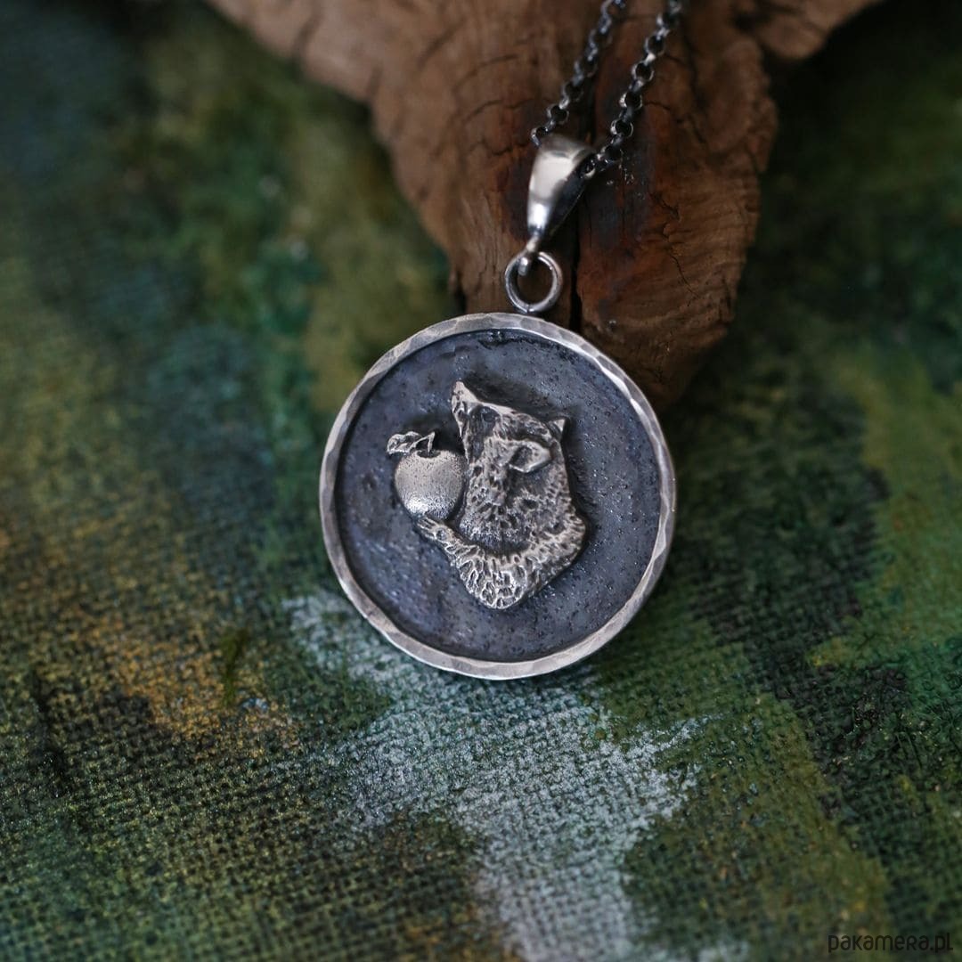 Ręcznie wykonany medalik z szopem praczem trzymającym jabłuszko umieściłam na łańcuszku z regulacją. Srebro pokryłam oksydą, która nadała mu stalowo szary odcień, wydobywając z powierzchni metalu głębię i niuanse faktury. Zawieszkę umieściłam na łańcuszku zakończonym zapięciem z regulacją.