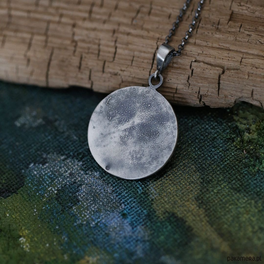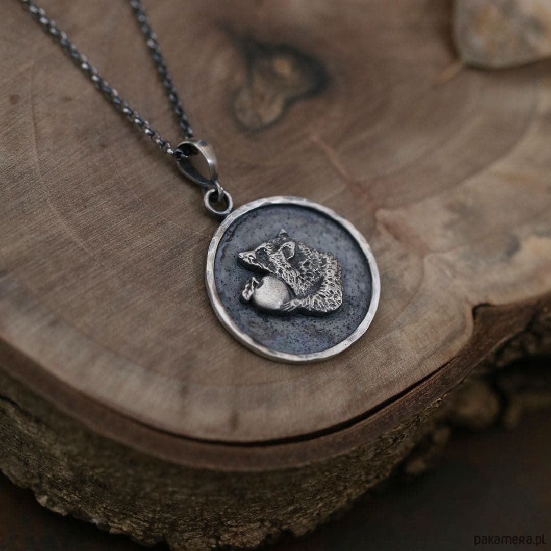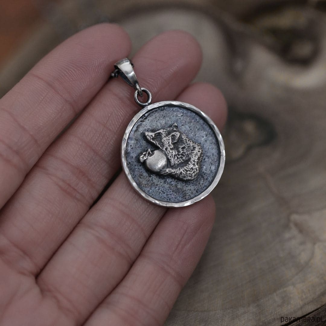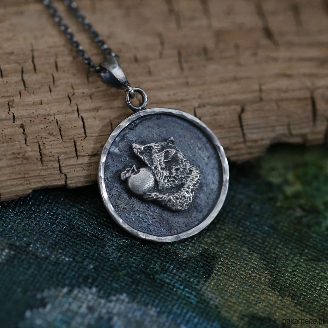 Ręcznie wykonany medalik z szopem praczem trzymającym jabłuszko umieściłam na łańcuszku z regulacją. Srebro pokryłam oksydą, która nadała mu stalowo szary odcień, wydobywając z powierzchni metalu głębię i niuanse faktury. Zawieszkę umieściłam na łańcuszku zakończonym zapięciem z regulacją.