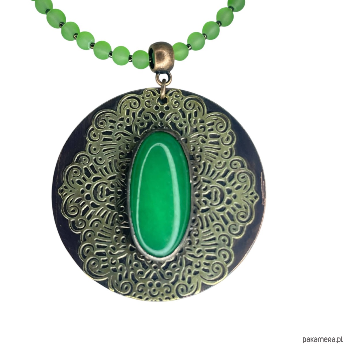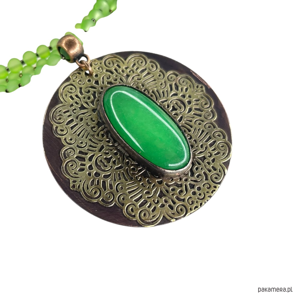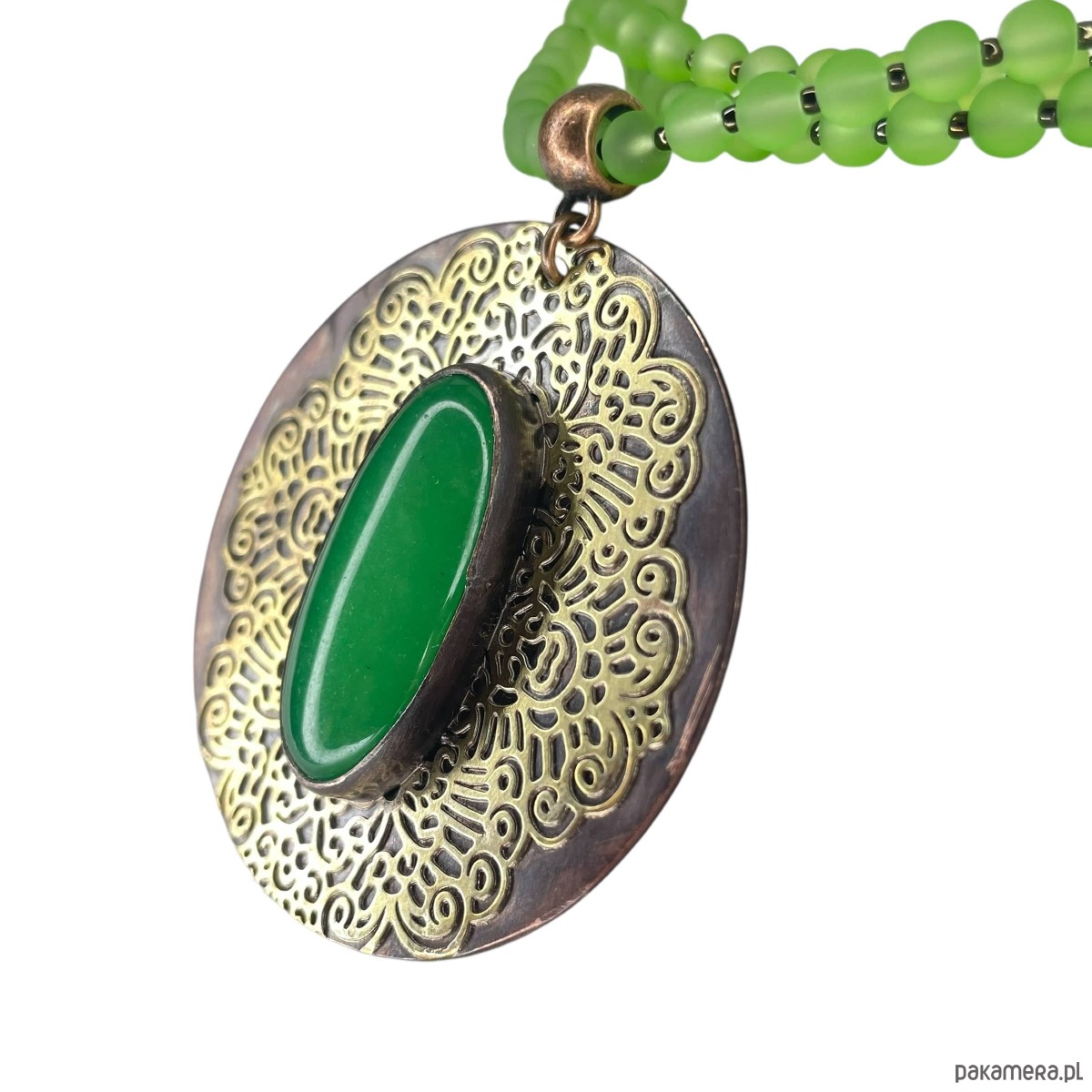 Okrągły wisior z jadeitem przyciąga uwagę owalnym kamieniem w intensywnym, zielonym odcieniu, osadzonym na okrągłym elemencie. Gładki kaboszon kontrastuje z dekoracyjnym, ażurowym motywem z mosiądzu, który tworzy wokół niego finezyjną oprawę i podkreśla naturalną barwę jadeitu. Zestawienie patynowanej miedzi z ciepłym, złotawym połyskiem mosiądzu nadaje całości eleganckiego, wyrazistego charakteru o artystycznym wyrazie.