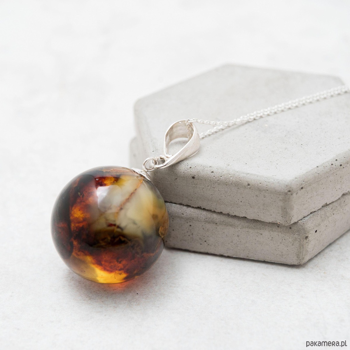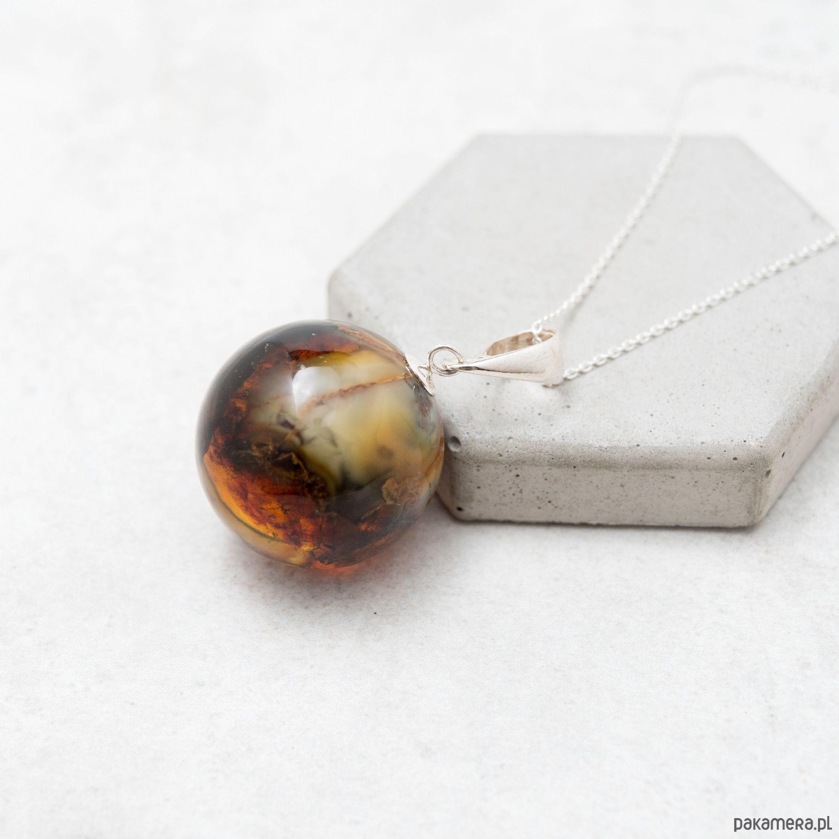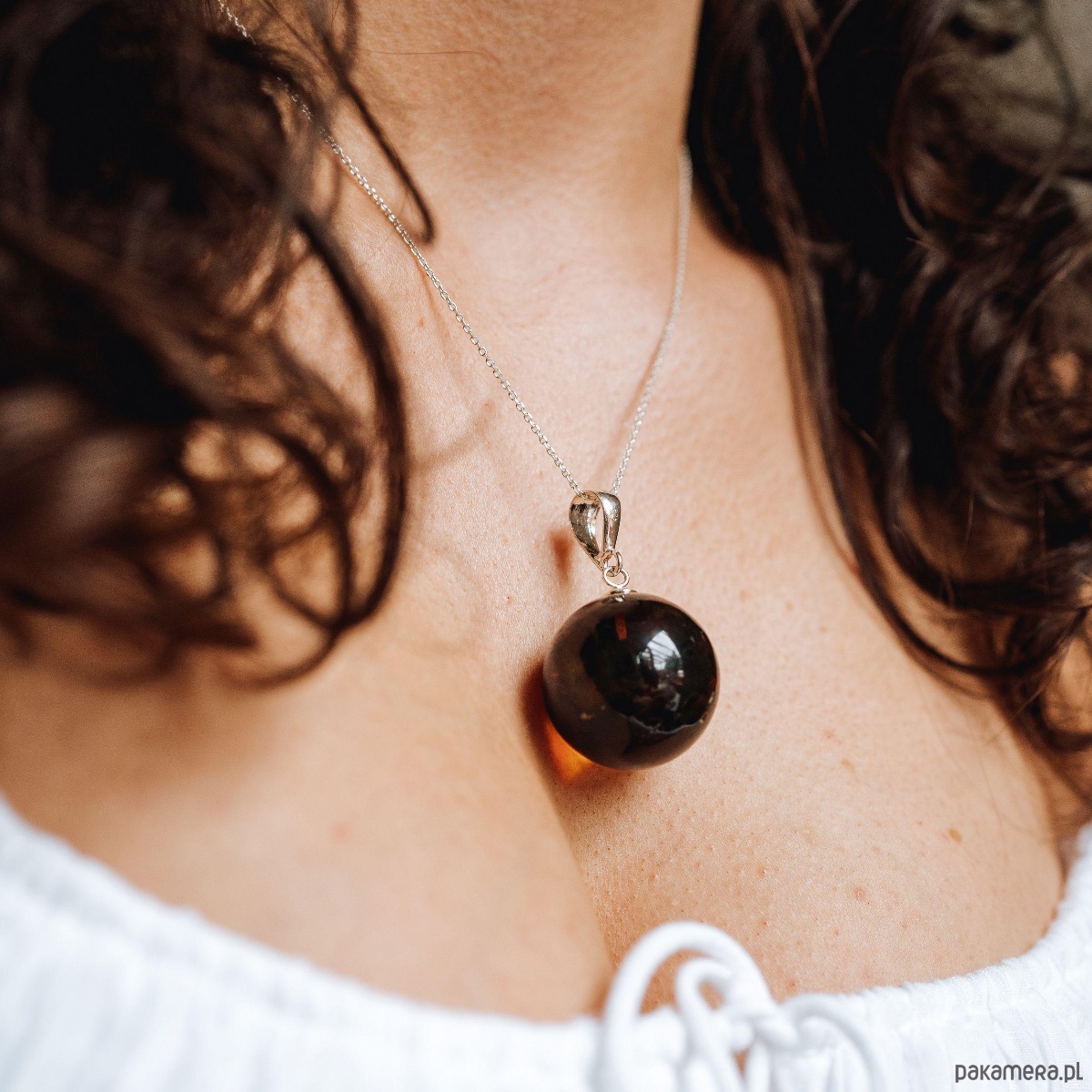 Okrągły wisiorek z czarnym bursztynem i srebrem - Kula bursztynowa - Zawieszka