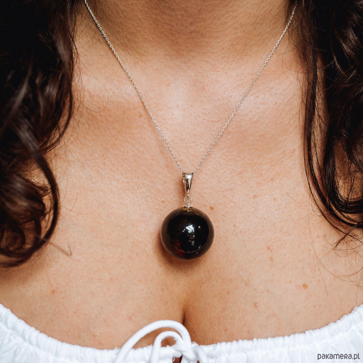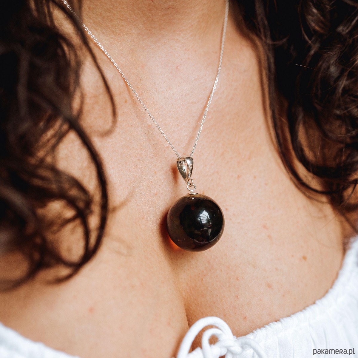 Okrągły wisiorek z naturalnym czarnym bursztynem osadzonym w srebrze próby 925 — wyrafinowany dodatek łączący klasykę z nowoczesnym minimalizmem. Głęboka, tajemnicza barwa kuli bursztynowej odsłania subtelne inkluzje i struktury, które nadają niepowtarzalny charakter.