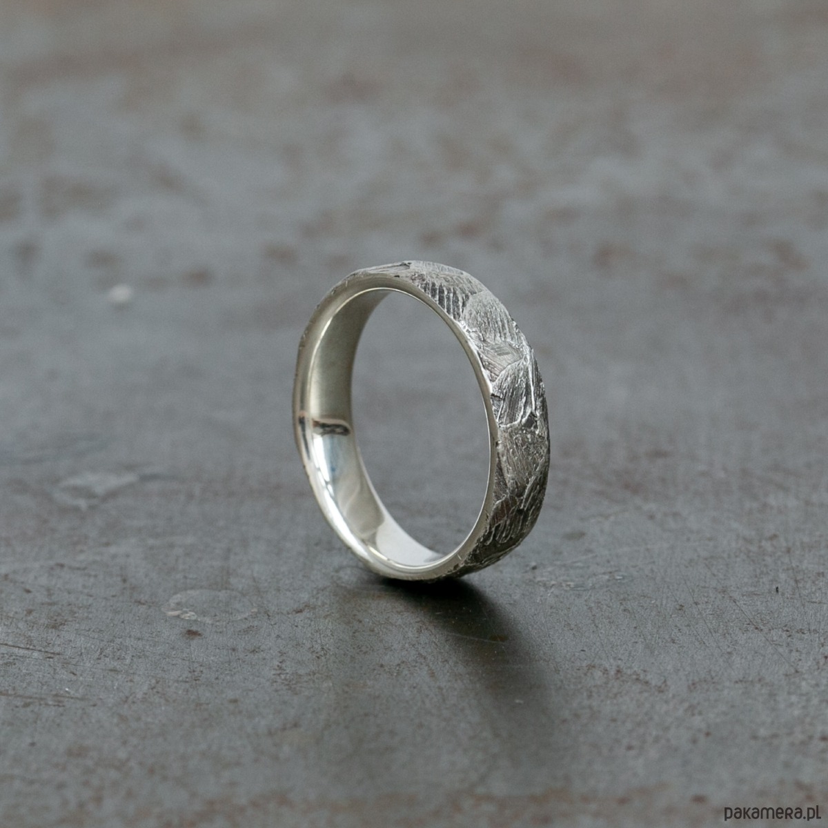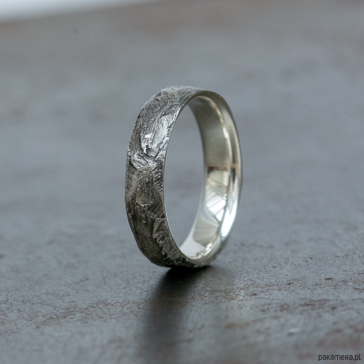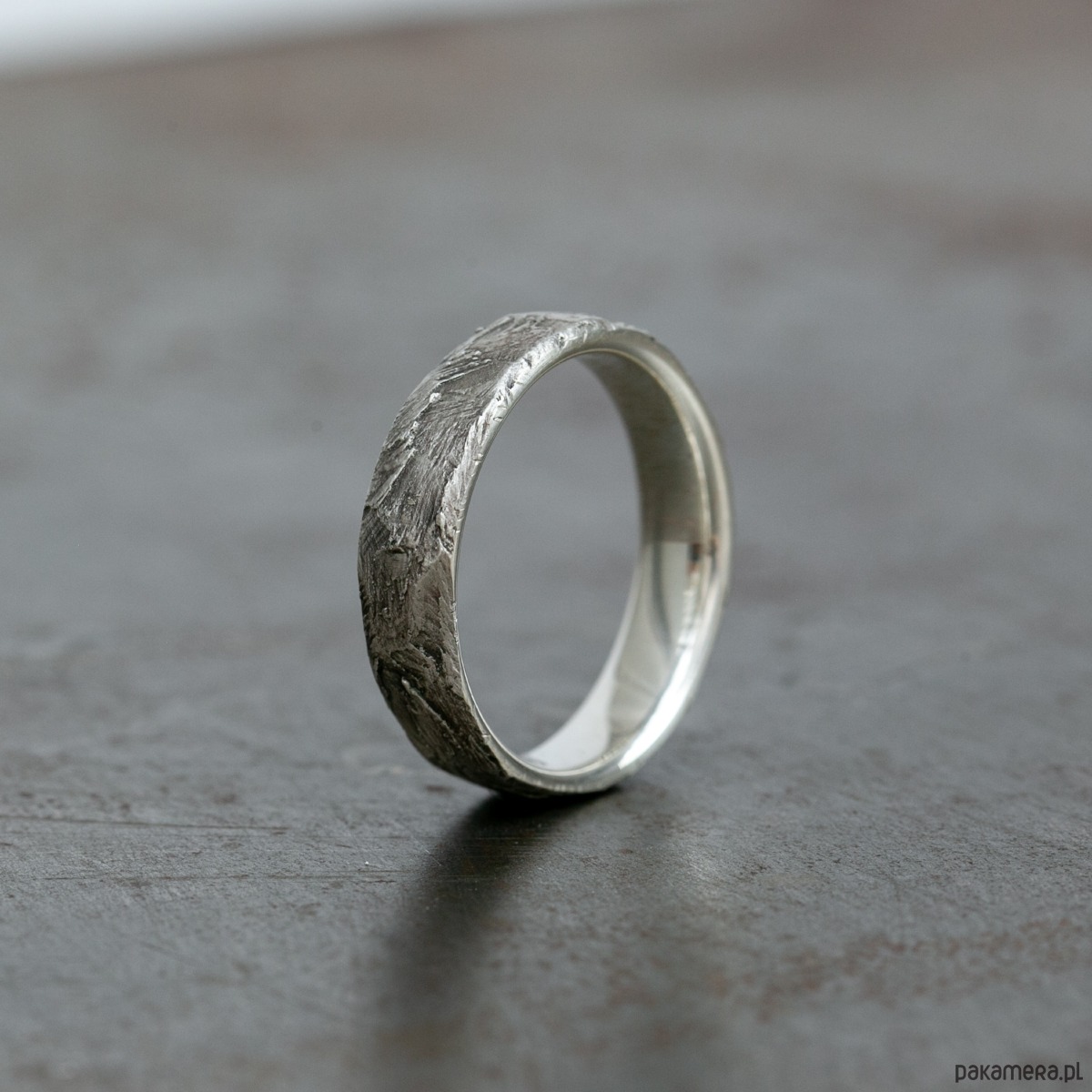 Oryginalna oksydowana srebrna obrączka z surową teksturą
