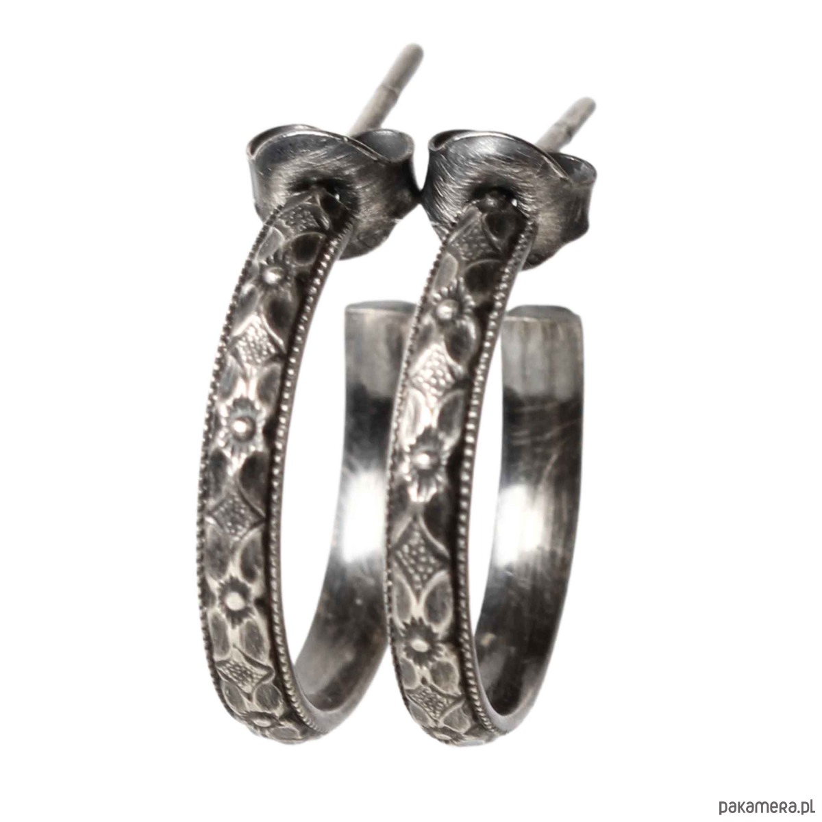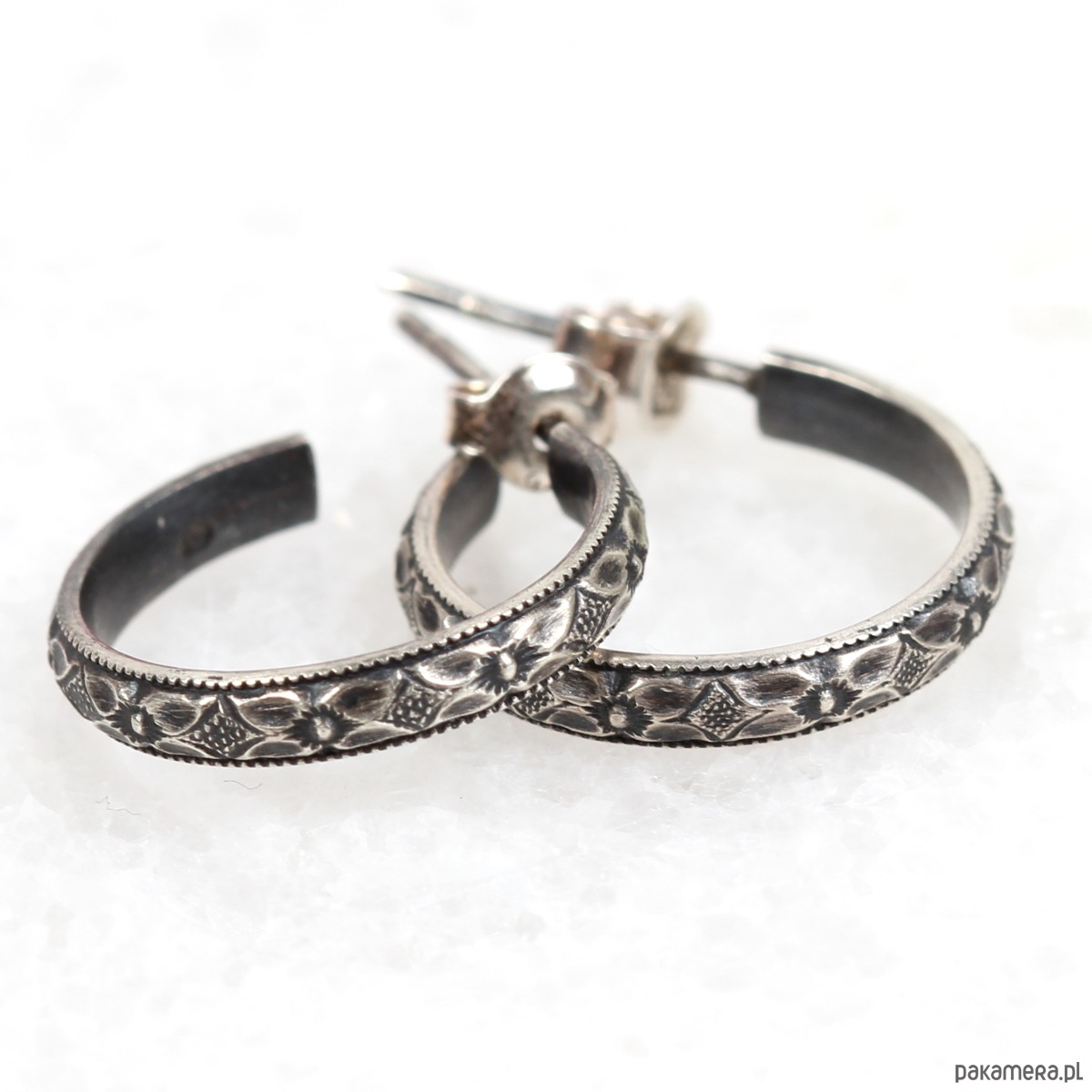 Ręcznie wykonane kolczyki koła ze srebra pokrytego ciemną oksydą z kwiatową fakturą