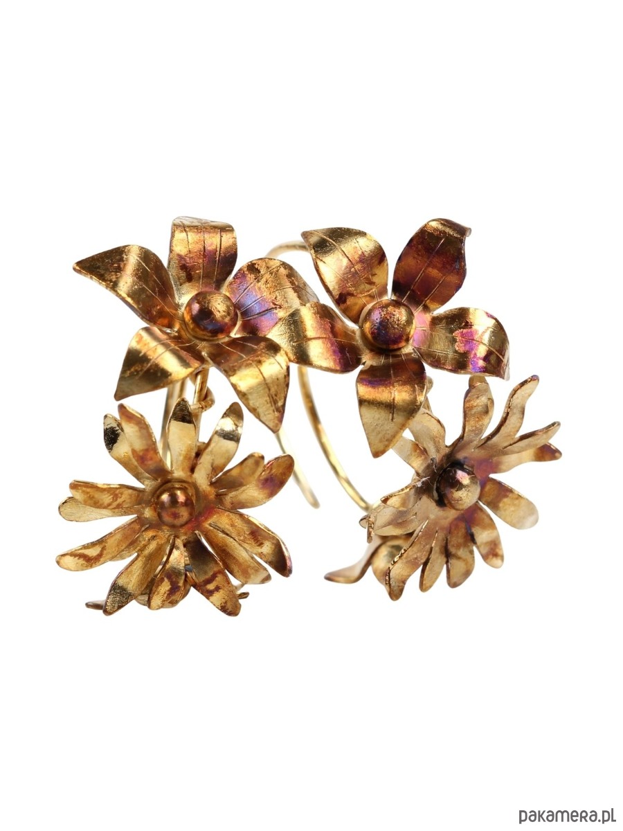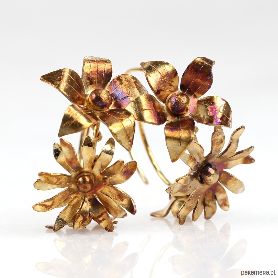 Ręcznie wykonane kolczyki koła ze srebra z trzema kwiatami dookoła, wykończone oksydą tęczową