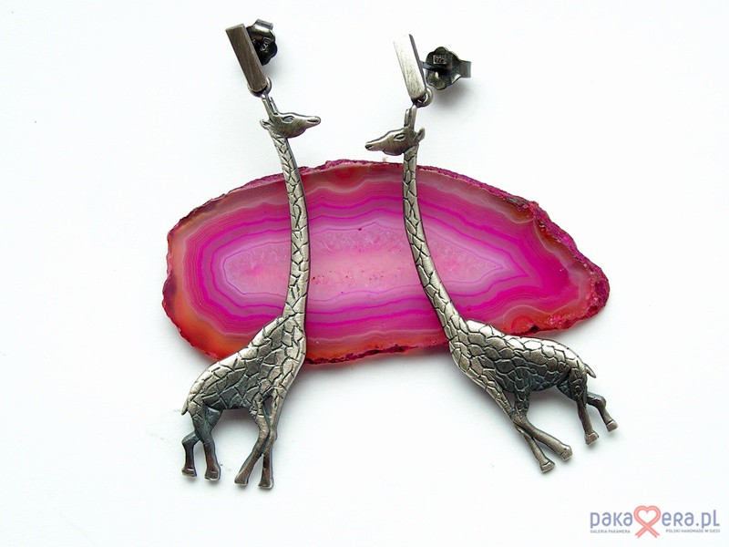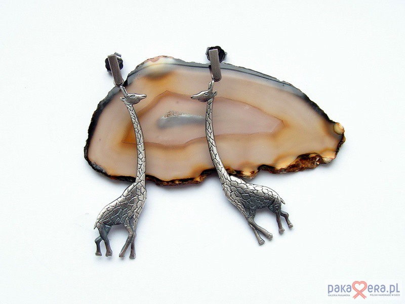 Niespotykane i bardzo oryginalne kolczyki w kształcie żyraf. Wykonane z oksydowanego srebra. Niebanalne i zwracające uwagę. Długość kolczyków 5,8 cm.