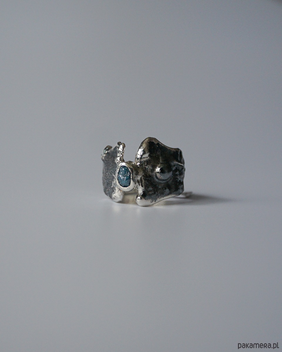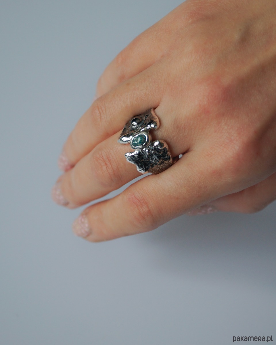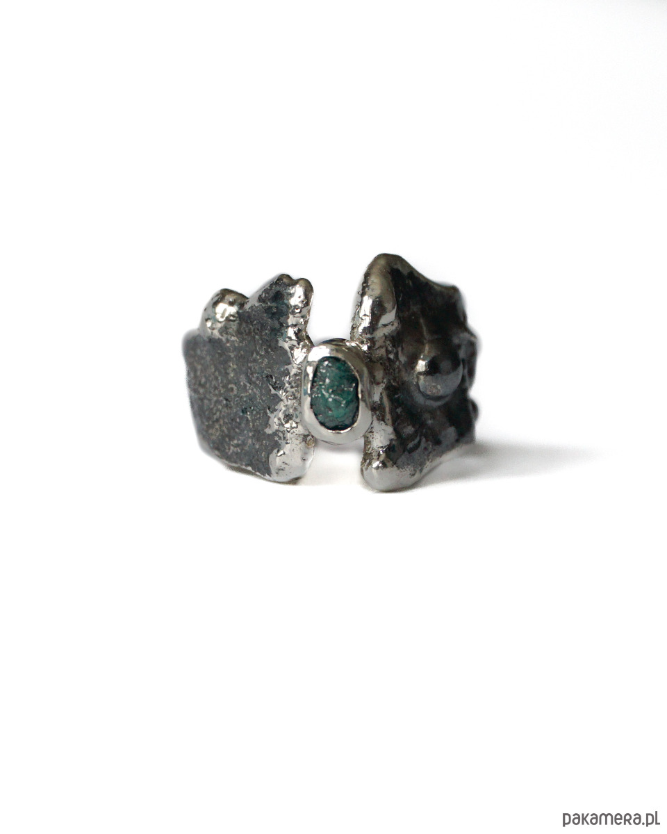 Niepowtarzalny oksydowany pierścionek stworzony złotniczą metodą podtapiania i zwieńczony surowym diamentem. Pierścionek wykonany w rozmiarze 14. W razie zamówienia pierścionka w innym rozmiarze prosimy o kontakt w celu ustalenia szczegółów.