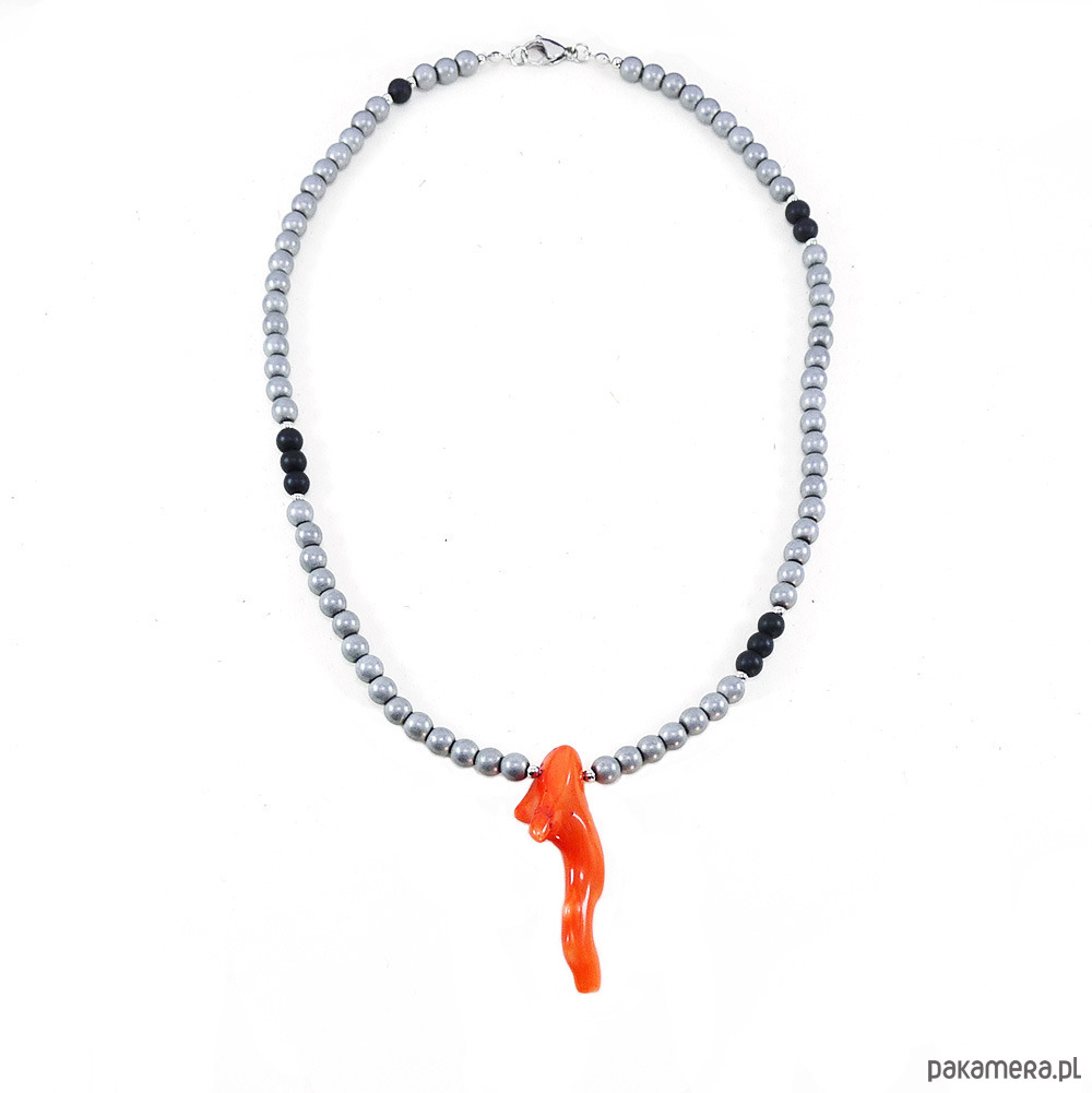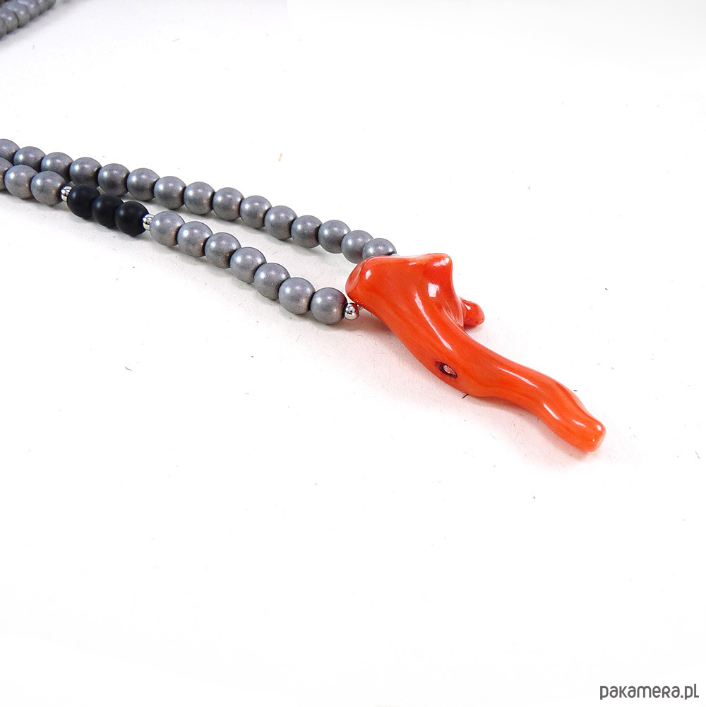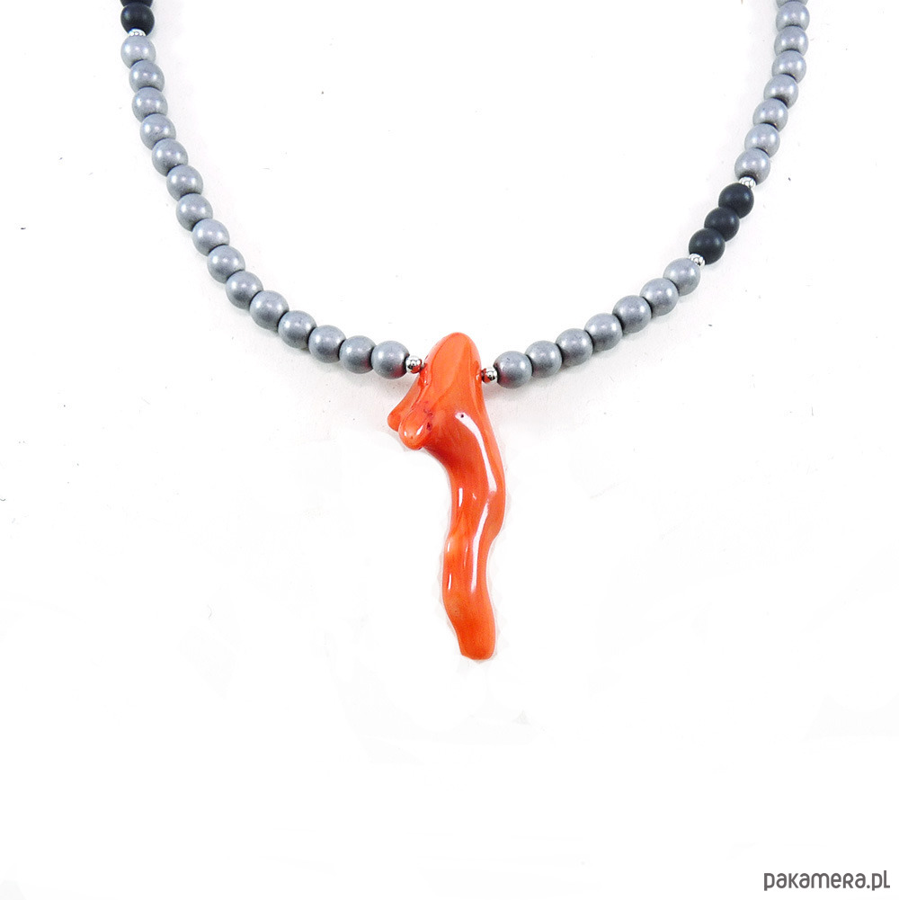 koral old orange 51 mm, hematyt matowy 6 mm, onyks 6 mm, hematyt, stal szlachetna