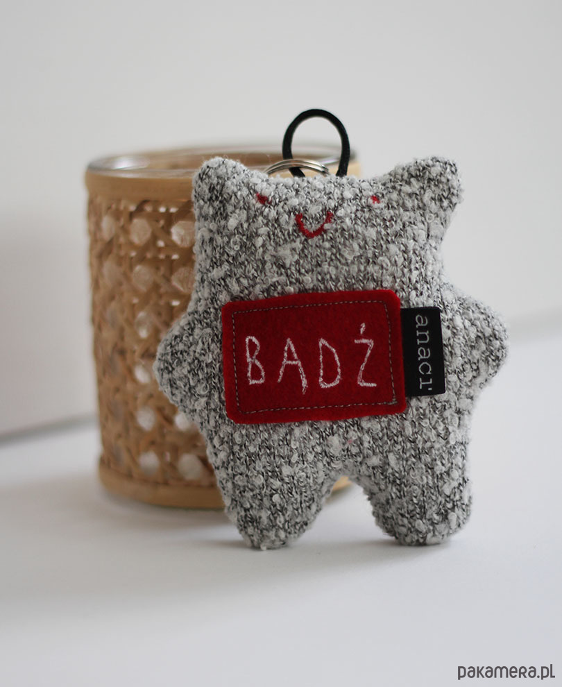 Mierzy sobie 11cm., uszyty z dzianiny swetrowej,wypchany włókniną, zaopatrzony w filcową plakietkę z wyhaftowaną dedykacją.
