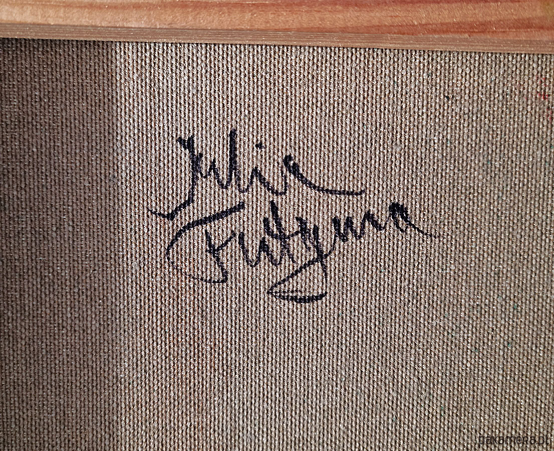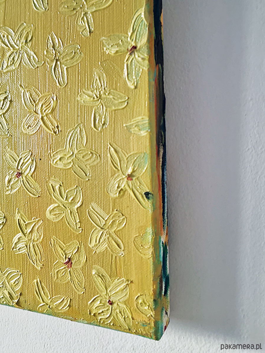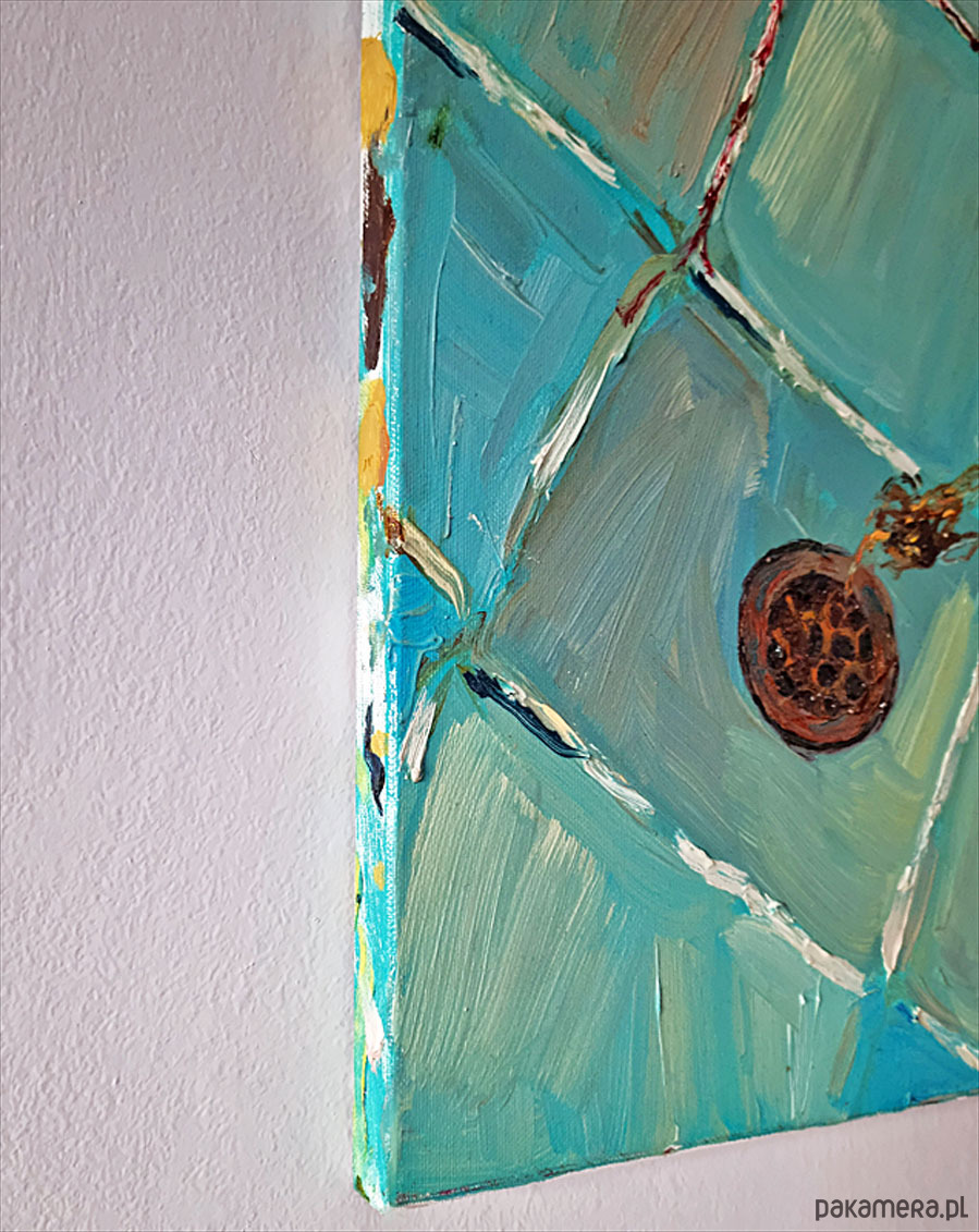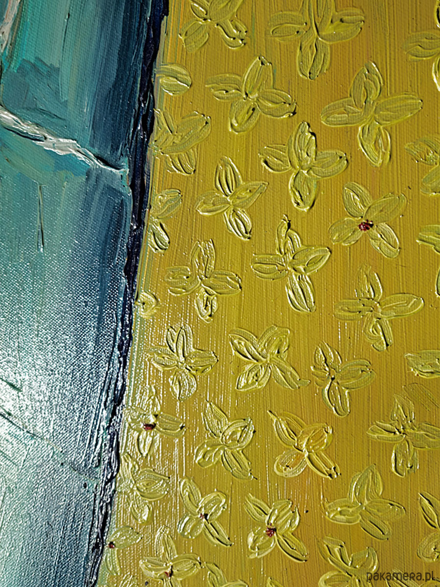 Faktura solidna, warstwowa, z wyraźnymi pociągnięciami pędzla. Na grubym krośnie, boki częściowo zamalowane, pozostawione do indywidualnej oprawy. Format poziomy - 50x 40 cm. Do dowolnej aranżacji lub na prezent :-).