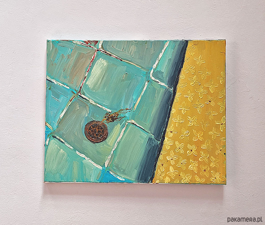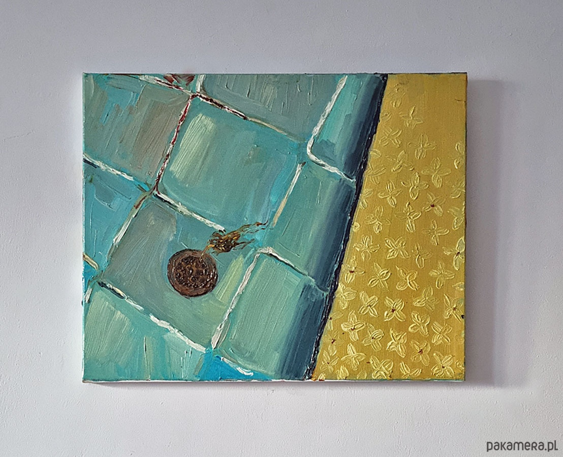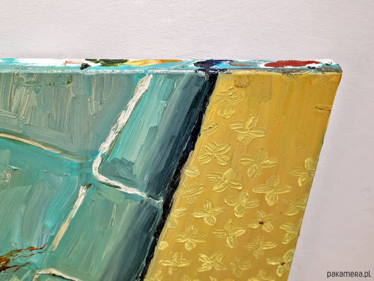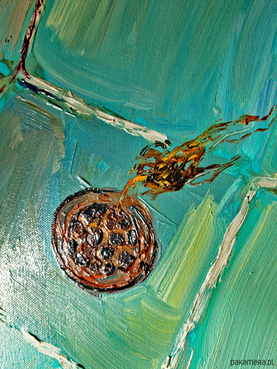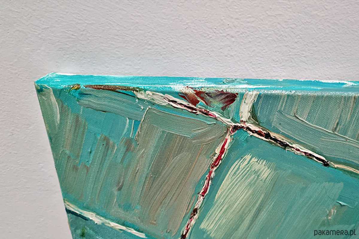 Faktura solidna, warstwowa, z wyraźnymi pociągnięciami pędzla. Na grubym krośnie, boki częściowo zamalowane, pozostawione do indywidualnej oprawy. Format poziomy - 50x 40 cm. Do dowolnej aranżacji lub na prezent :-).