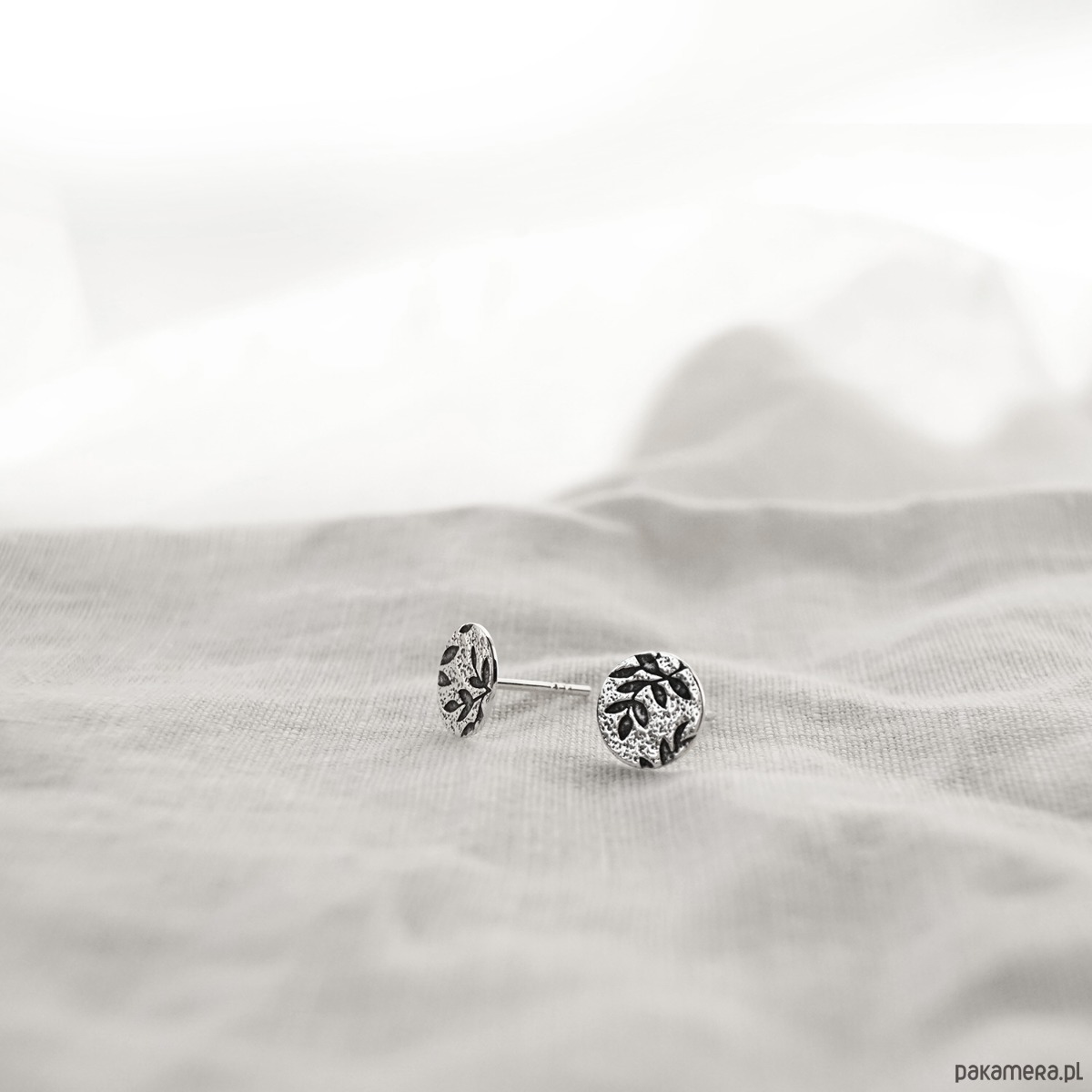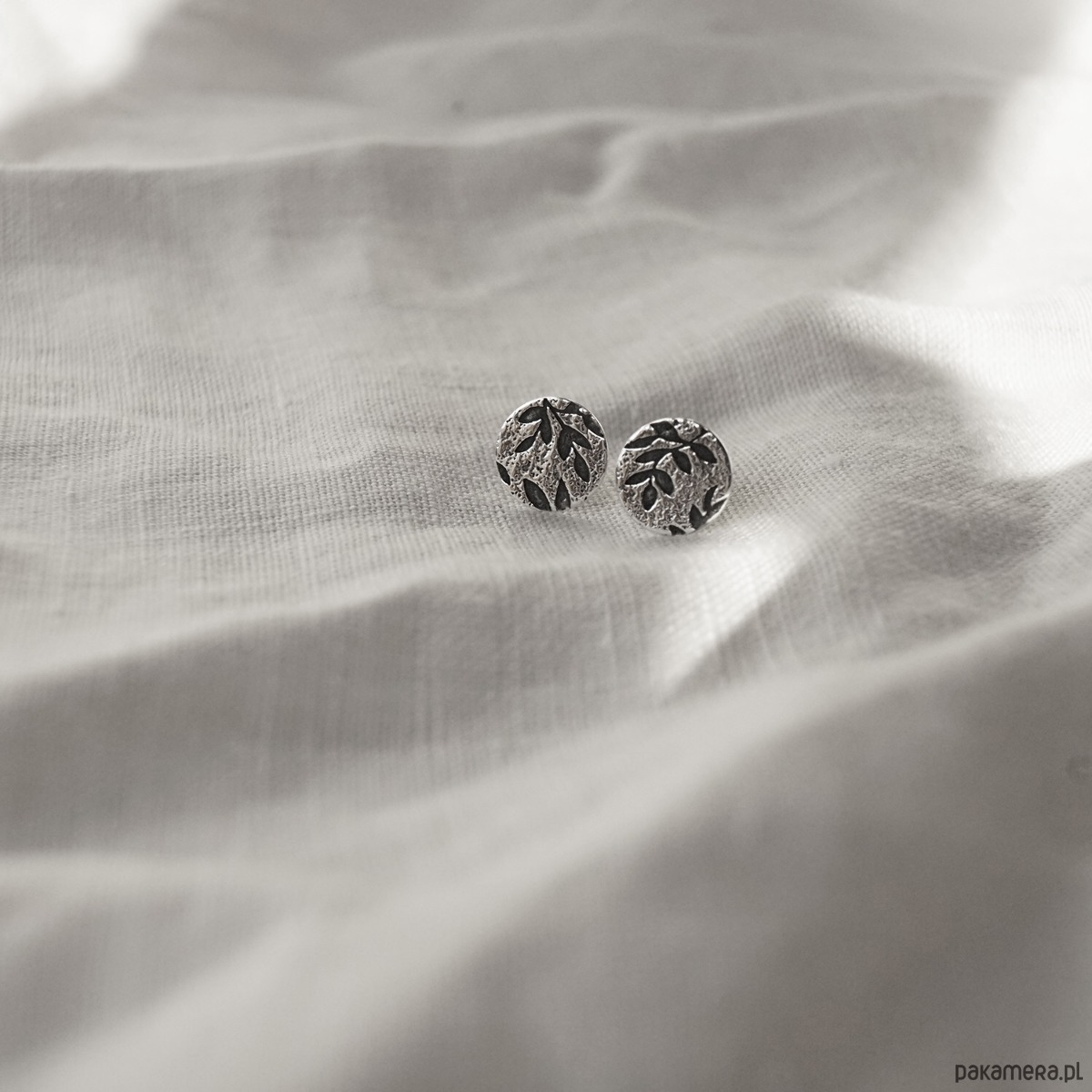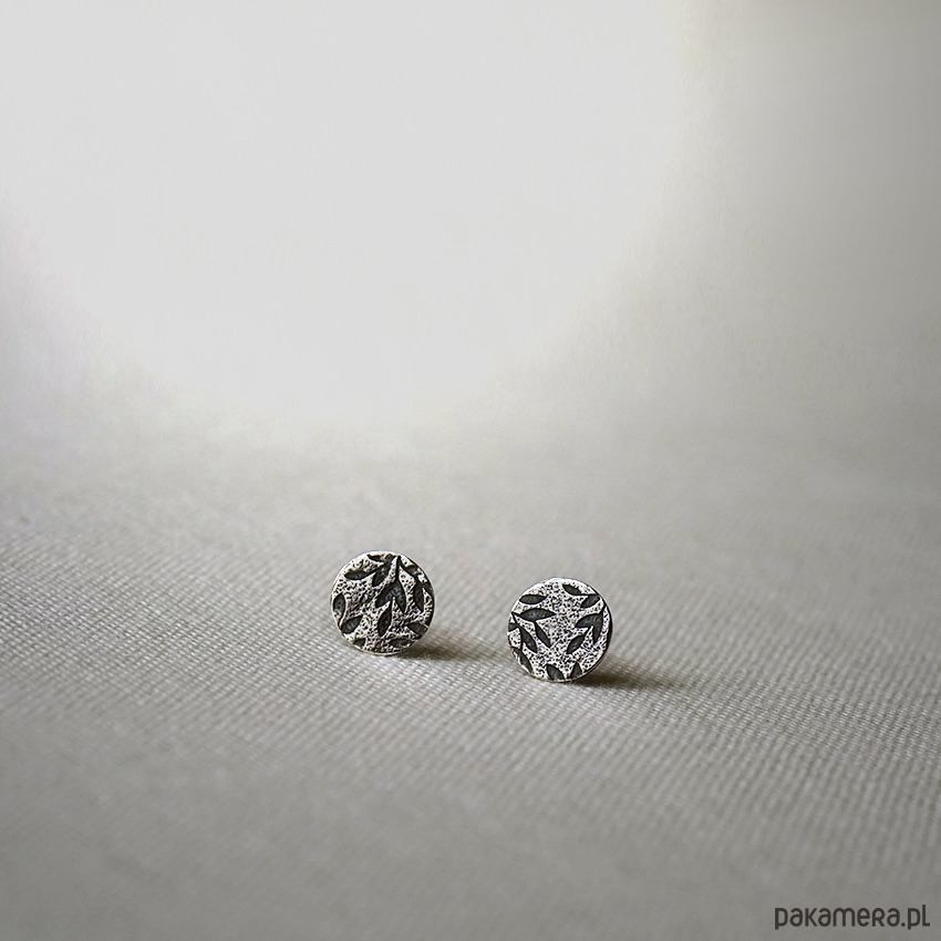 Kolczyki są częścią kolekcji Olive tree, w której pojawia się roślinny motyw oliwnych listków. Wzór umieszczony jest na fakturowanym srebrze i podkreślony oksydowaniem. Dla kontrastu różne elementy biżuterii wykończone są również bardzo ciemnym srebrem.