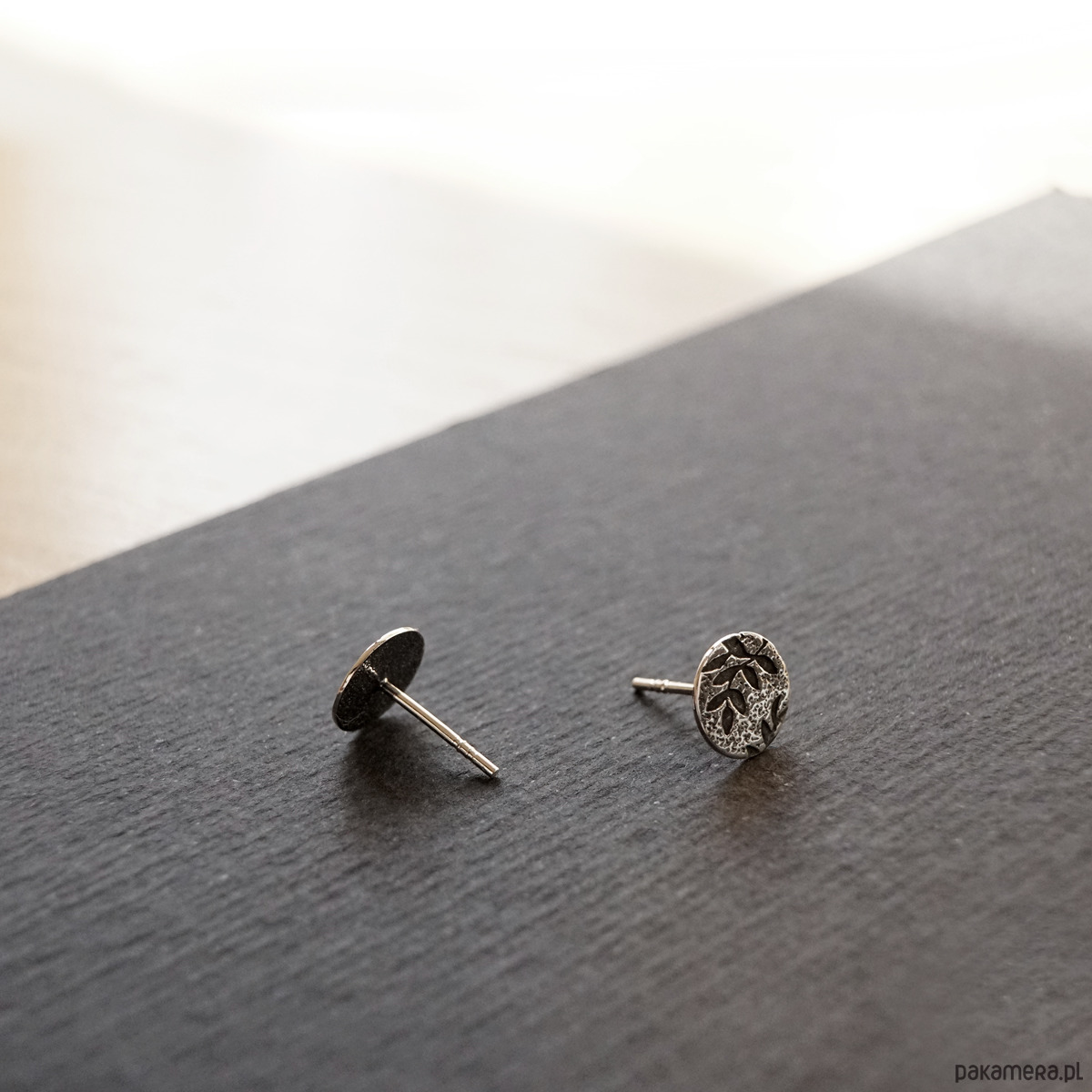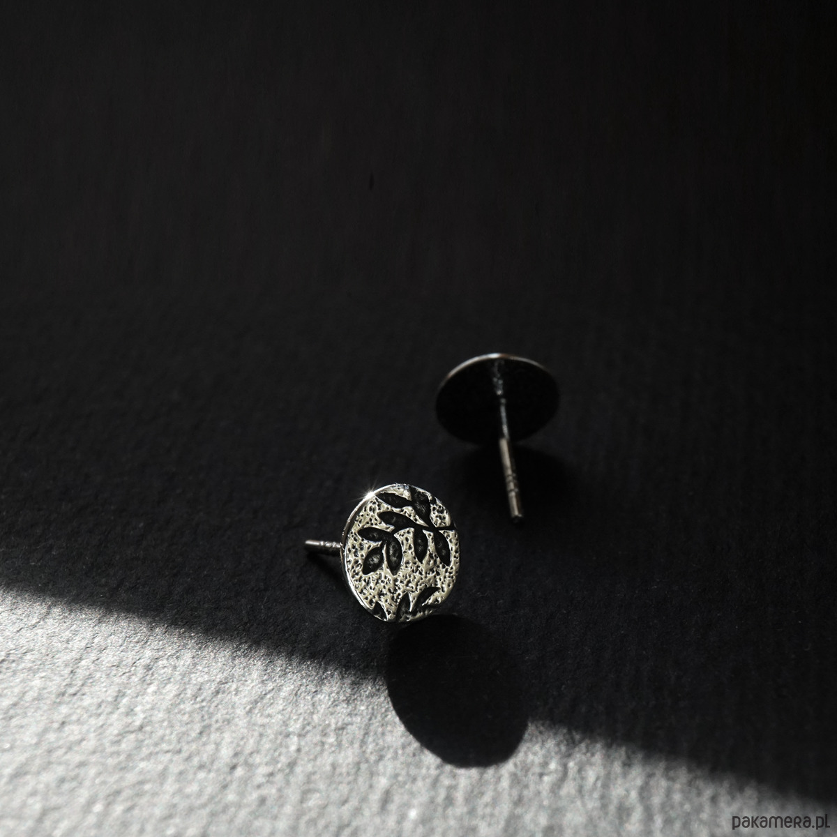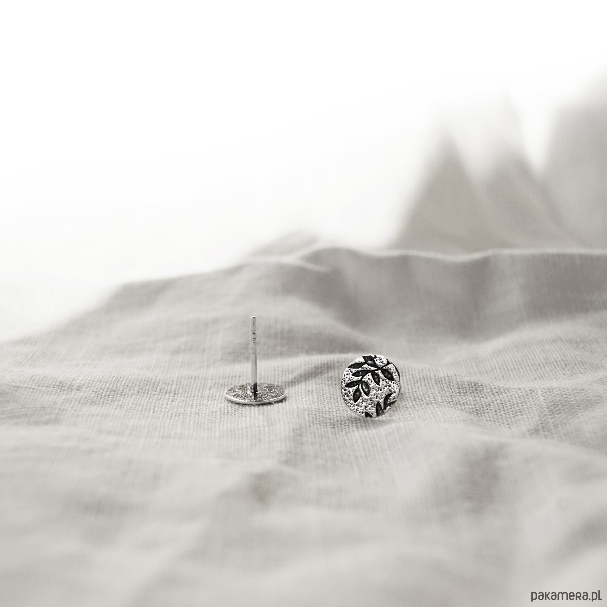 Kolczyki są częścią kolekcji Olive tree, w której pojawia się roślinny motyw oliwnych listków. Wzór umieszczony jest na fakturowanym srebrze i podkreślony oksydowaniem. Dla kontrastu różne elementy biżuterii wykończone są również bardzo ciemnym srebrem.