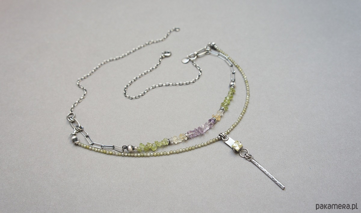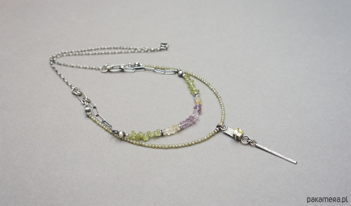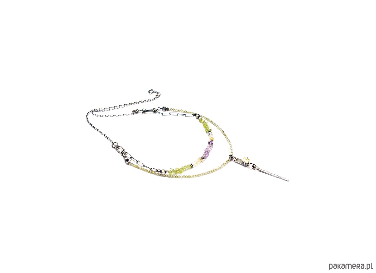 Krótki naszyjnik wykonany od podstaw ze srebra [pr. 925] w połączeniu z fasetowanymi cyrkoniami [2mm], cytrynami ametystami i perydotami w kształcie nieforemnych bryłek oraz cyrkonią w kasetce [5mm x5mm]. Srebro oksydowane i przetarte. Całkowita długość krótszego łańcuszka 48,5cm. Biżuteria ozdobnie zapakowana.