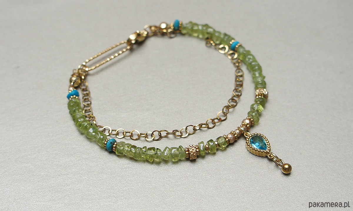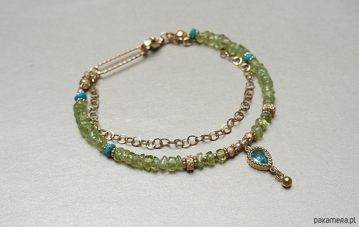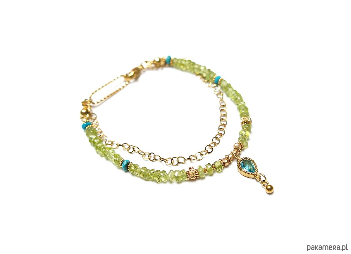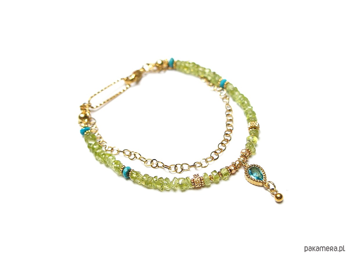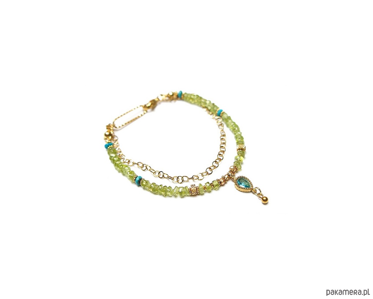 Bransoletka wykonana z pozłacanej stali szlachetnej oraz naturalnych, szlachetnych kamieni - talarki nieregularnego oliwinu [4 x 2mm,] oponki fasetowane naturalnego turkusu beauty wysokiej jakości [4 x 2mm],oponek z hematytu fasetowanego, platerowanego [3 x 2mm], przekładek z hematytu [1mm] oraz zawieszki z cyrkonią w okuciu. Bransoletka o długości ok. 20cm.