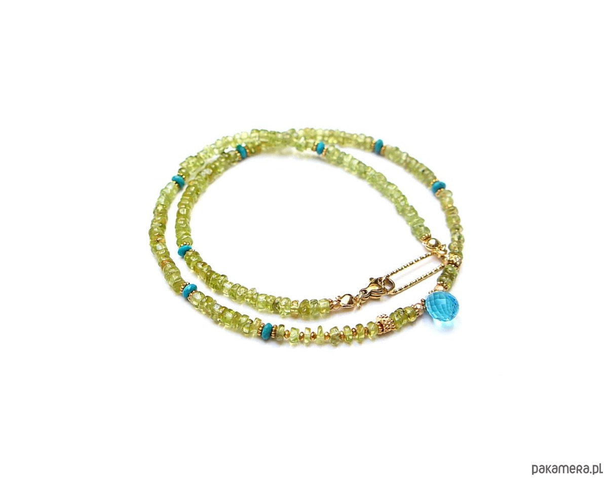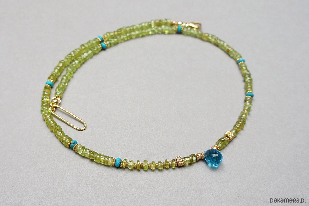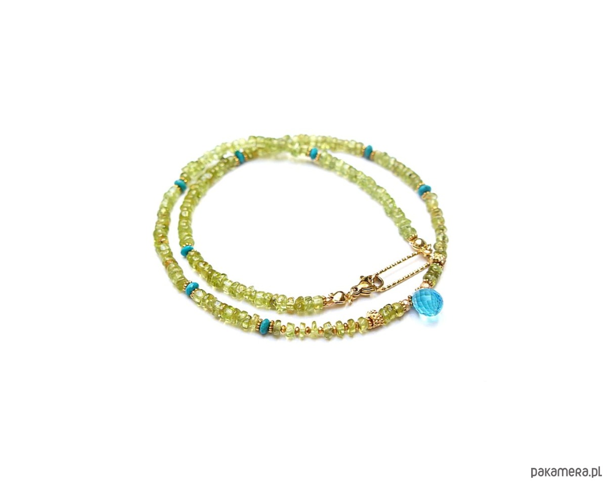Krótki naszyjnik wykonany z pozłacanej stali szlachetnej oraz naturalnych, szlachetnych kamieni - talarki nieregularnego oliwinu [4 x 2mm,] oponki fasetowane naturalnego turkusu beauty wysokiej jakości [4 x 2mm],oponek z hematytu fasetowanego, platerowanego [3 x 2mm], przekładek z hematytu [1mm] oraz zawieszki z kwarcu w kształcie fasetowanej brioletki. Naszyjnik o długości ok. 42,5cm.