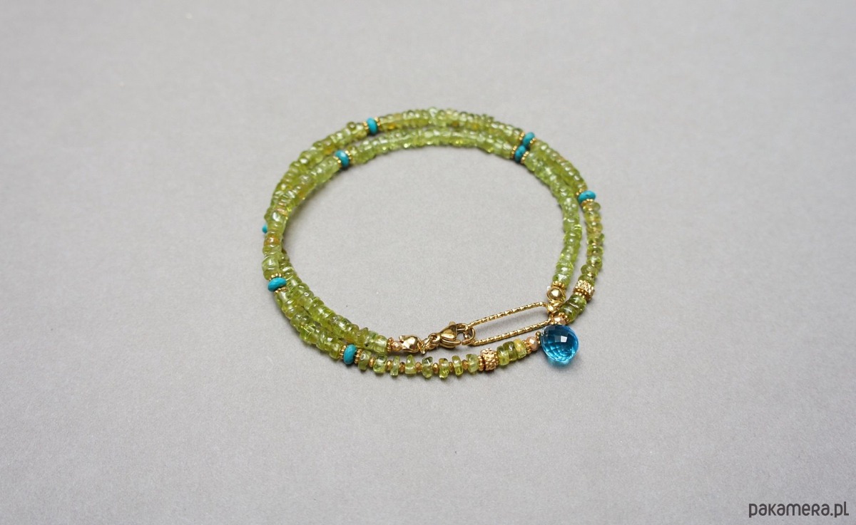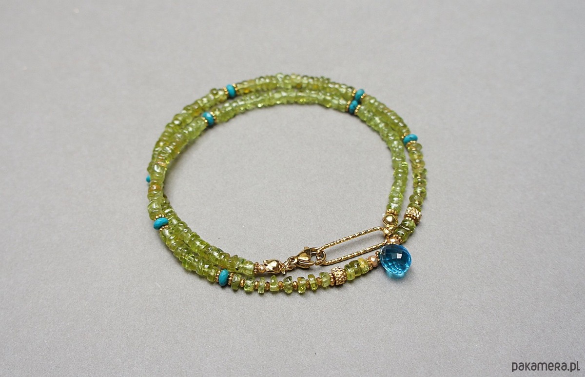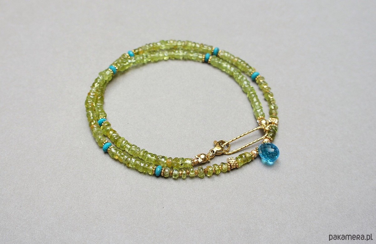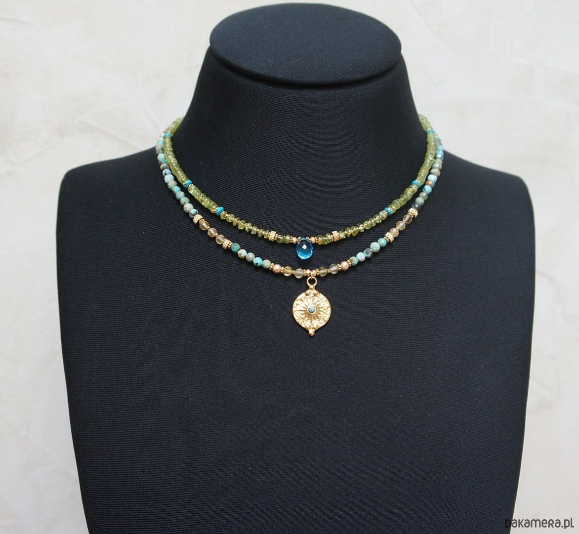 Krótki naszyjnik wykonany z pozłacanej stali szlachetnej oraz naturalnych, szlachetnych kamieni - talarki nieregularnego oliwinu [4 x 2mm,] oponki fasetowane naturalnego turkusu beauty wysokiej jakości [4 x 2mm],oponek z hematytu fasetowanego, platerowanego [3 x 2mm], przekładek z hematytu [1mm] oraz zawieszki z kwarcu w kształcie fasetowanej brioletki. Naszyjnik o długości ok. 42,5cm.