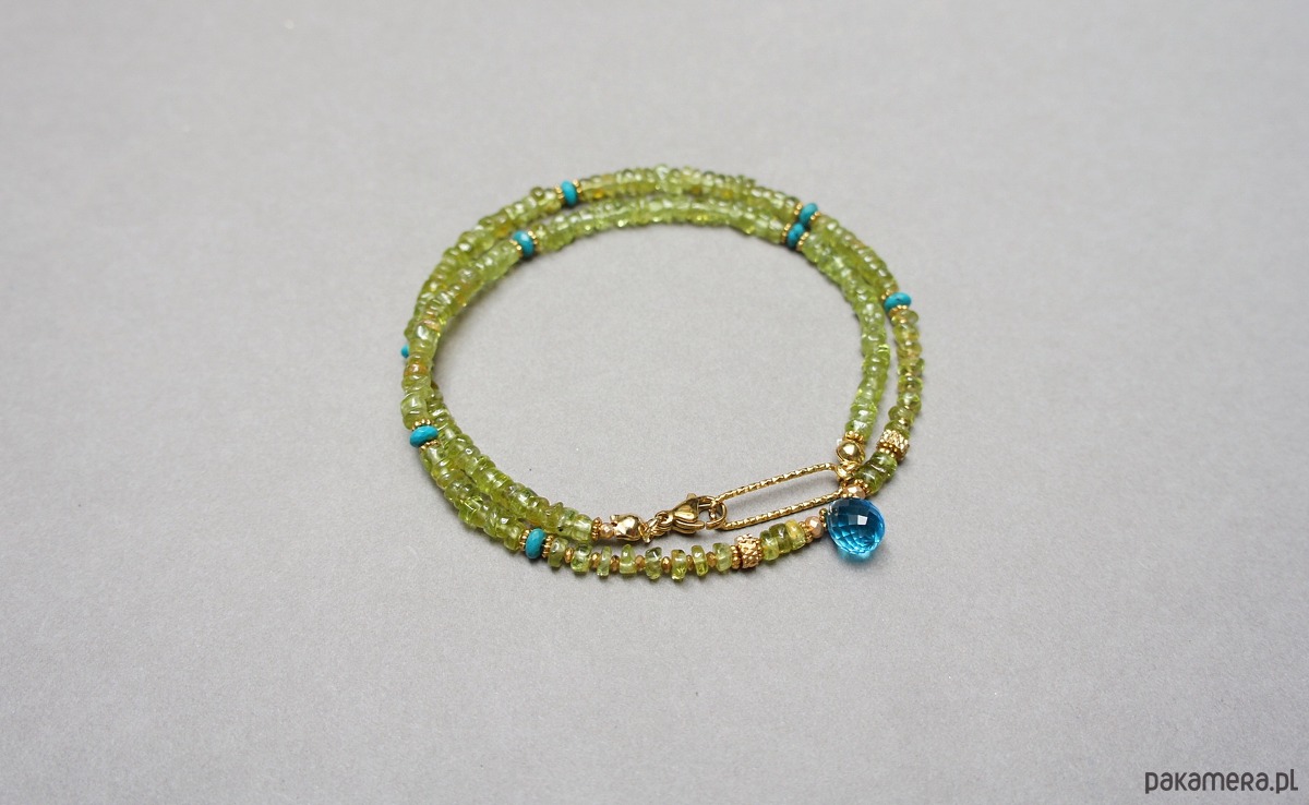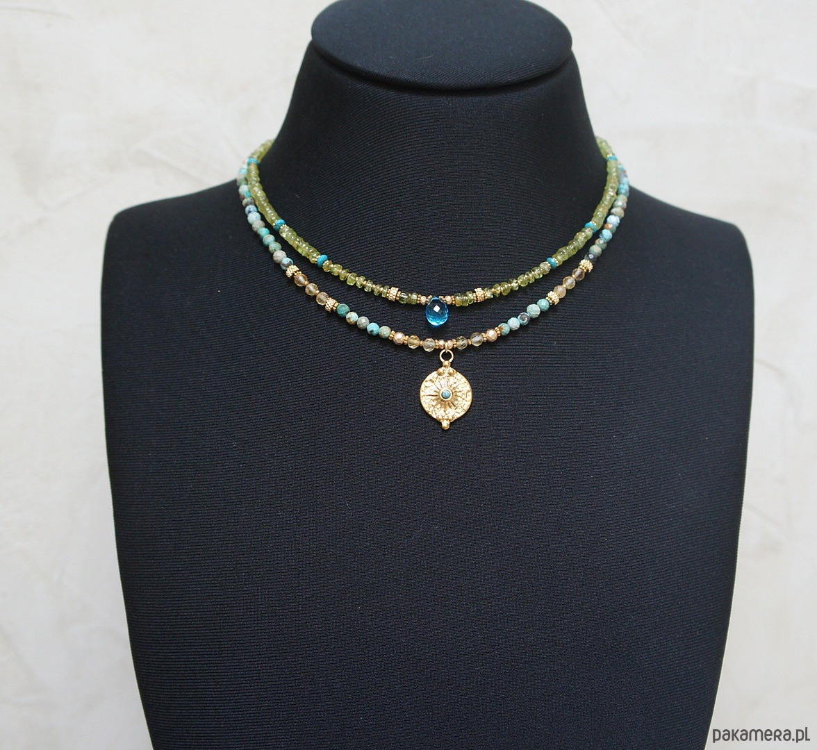 Krótki naszyjnik wykonany z pozłacanej stali szlachetnej oraz naturalnych, szlachetnych kamieni - talarki nieregularnego oliwinu [4 x 2mm,] oponki fasetowane naturalnego turkusu beauty wysokiej jakości [4 x 2mm],oponek z hematytu fasetowanego, platerowanego [3 x 2mm], przekładek z hematytu [1mm] oraz zawieszki z kwarcu w kształcie fasetowanej brioletki. Naszyjnik o długości ok. 42,5cm.