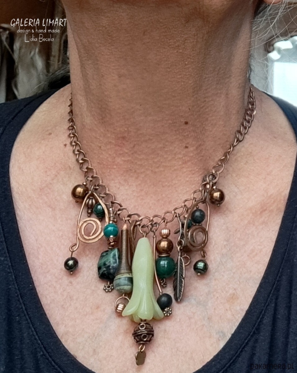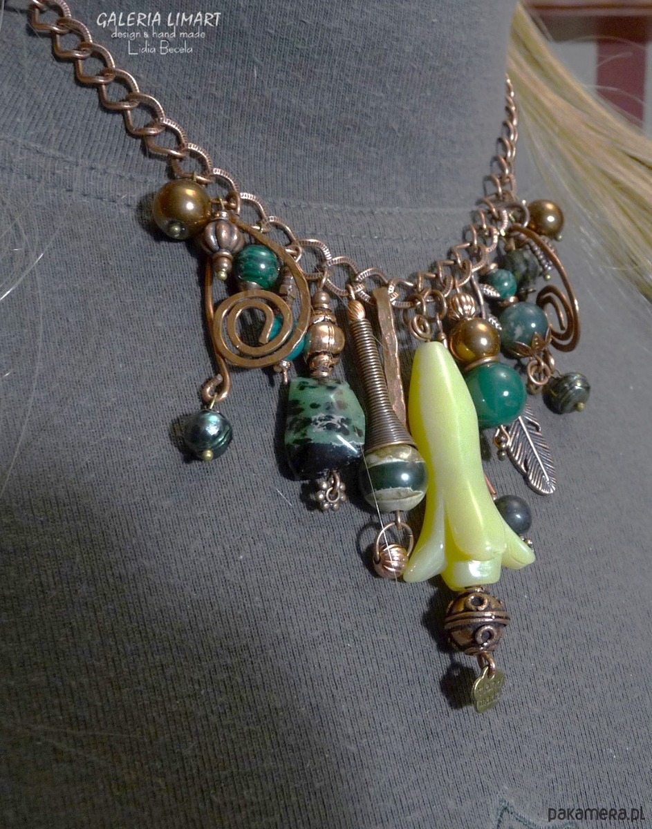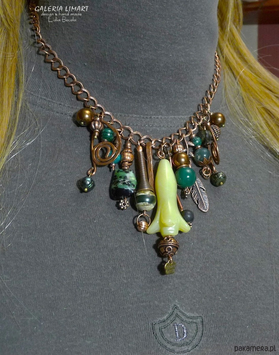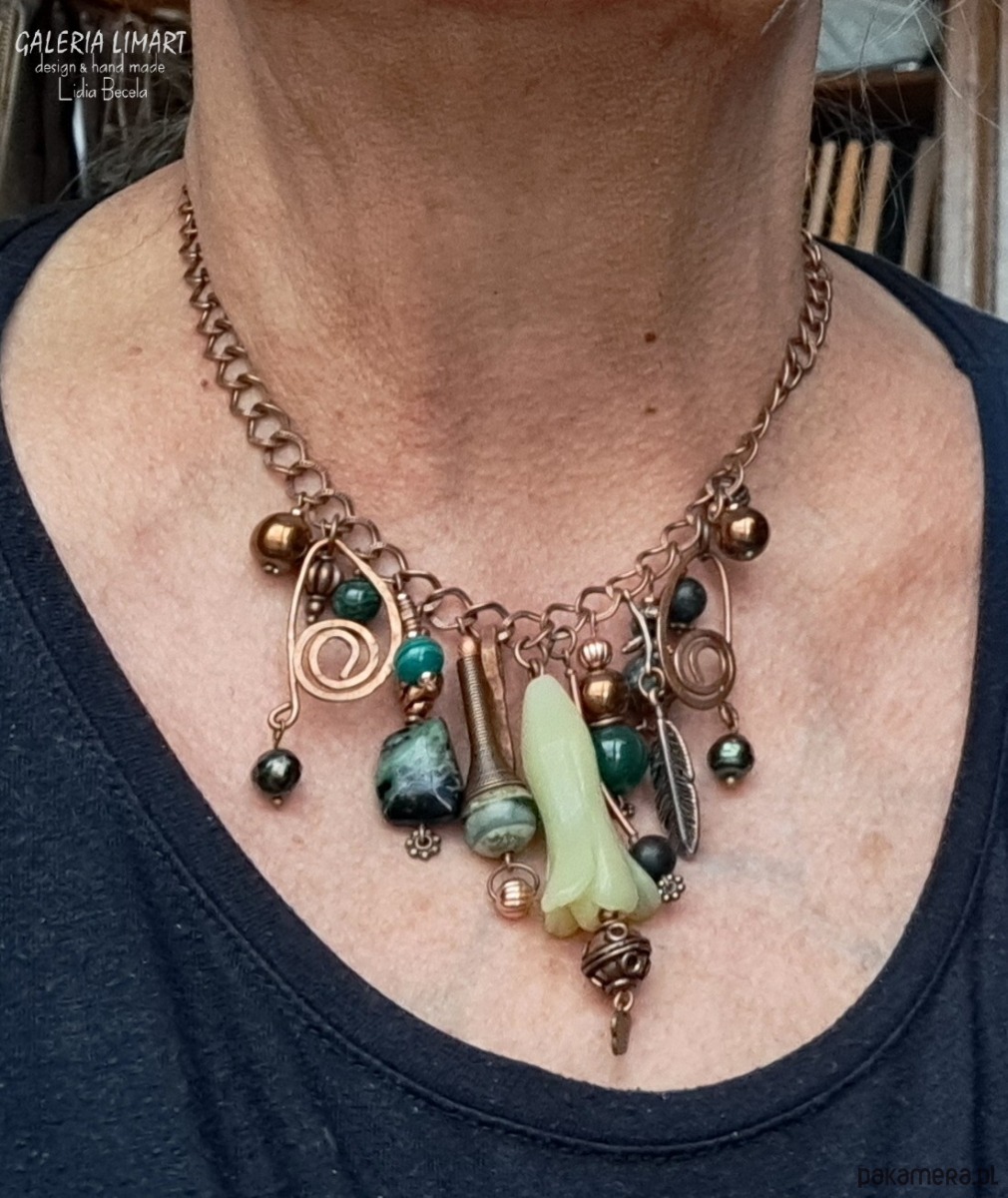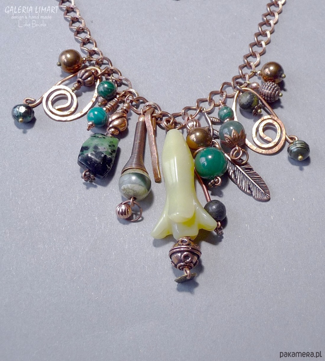 Wielki piękny okaz "tulipana" z naturalnego oliwinu w oliwkowym ciepłym ubarwieniu zawieszony został na miedzianym łańcuchu długości 44 cm dodatkowo ozdobionym mnóstwem różnych minerałów takich jak oliwin, agat, turkus afrykański, jaspis, perełki, szkło weneckie utrzymanych w tonacji cudnej ciepłej zieleni plus ozdoby z repusowane miedzi oraz przywieszki w kolorze starej miedzi, co stworzyło perfekcyjną kompozycję kolorystyczną :).