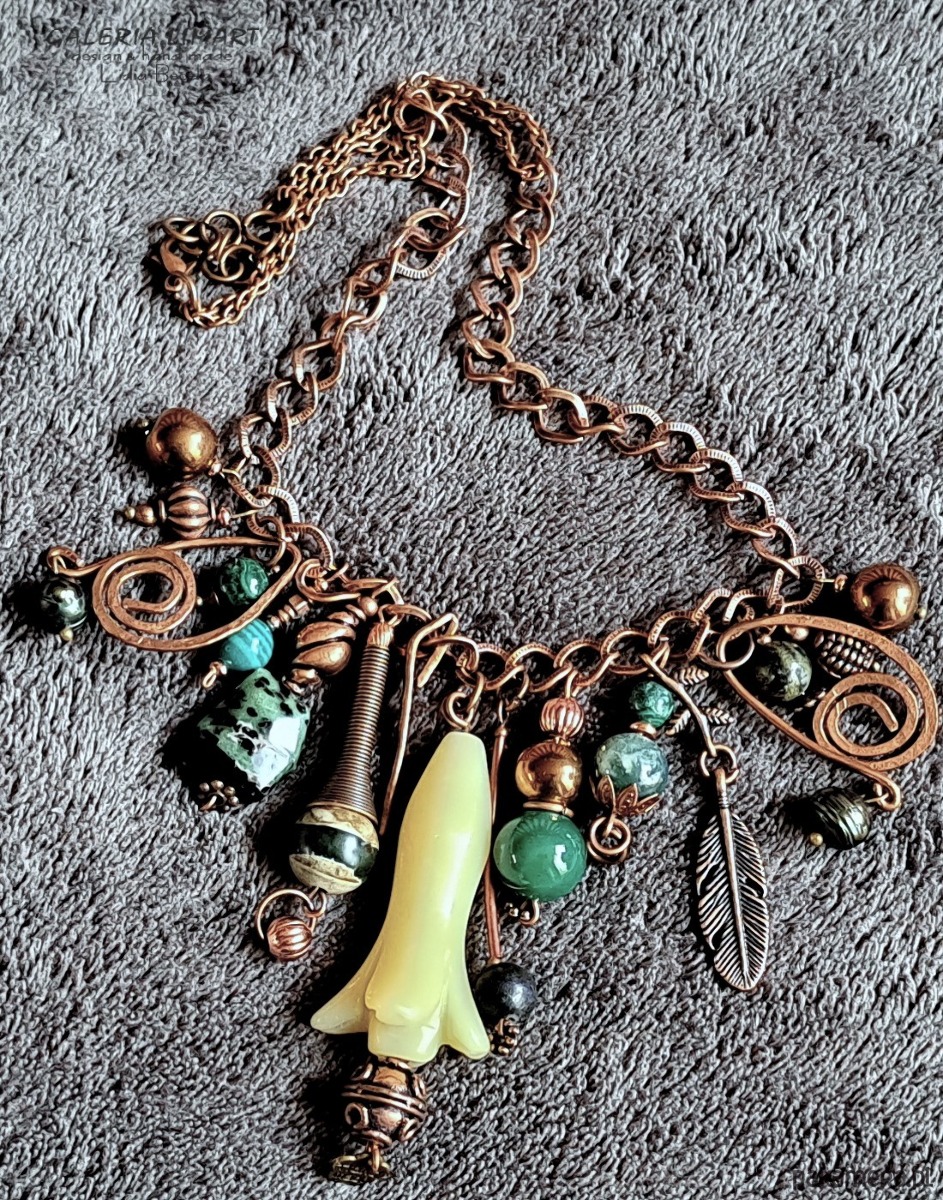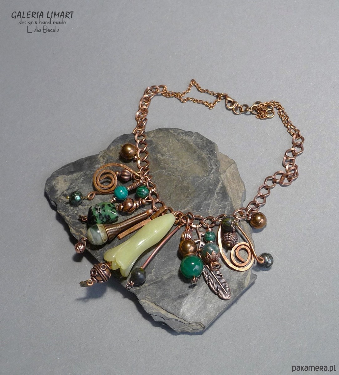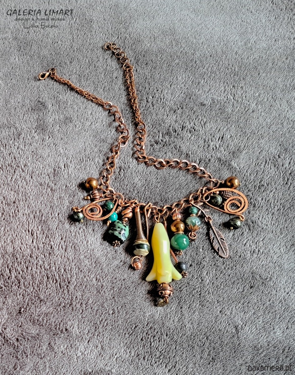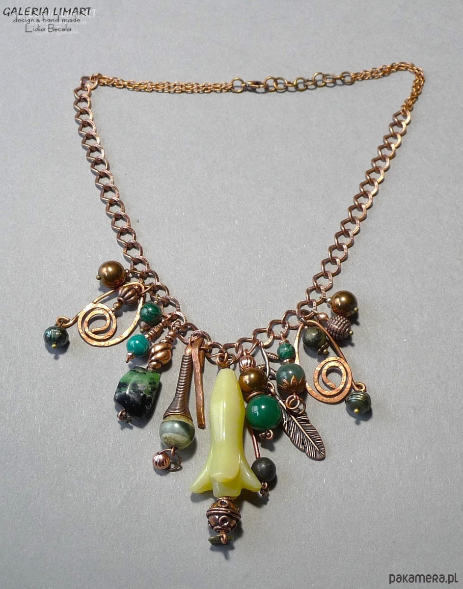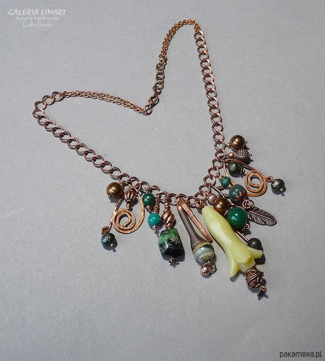 Wielki piękny okaz "tulipana" z naturalnego oliwinu w oliwkowym ciepłym ubarwieniu zawieszony został na miedzianym łańcuchu długości 44 cm dodatkowo ozdobionym mnóstwem różnych minerałów takich jak oliwin, agat, turkus afrykański, jaspis, perełki, szkło weneckie utrzymanych w tonacji cudnej ciepłej zieleni plus ozdoby z repusowane miedzi oraz przywieszki w kolorze starej miedzi, co stworzyło perfekcyjną kompozycję kolorystyczną :).