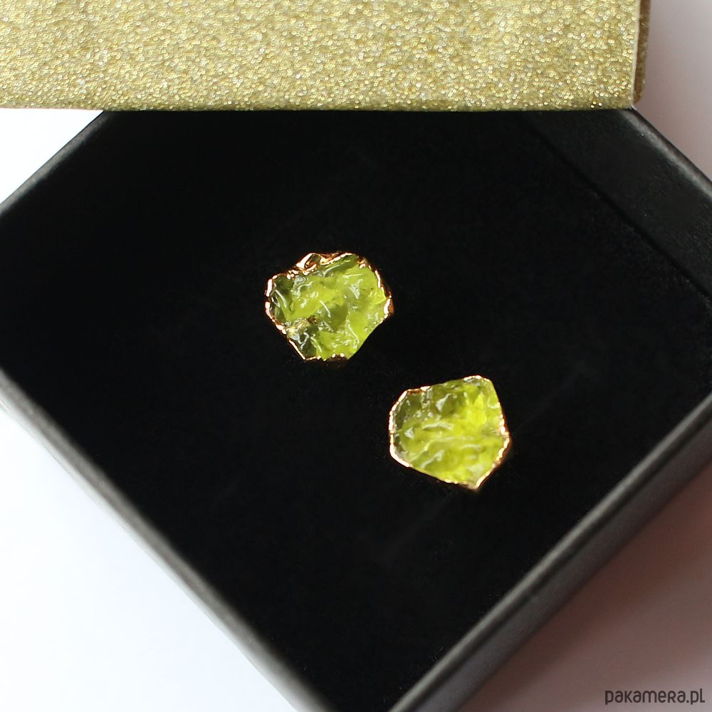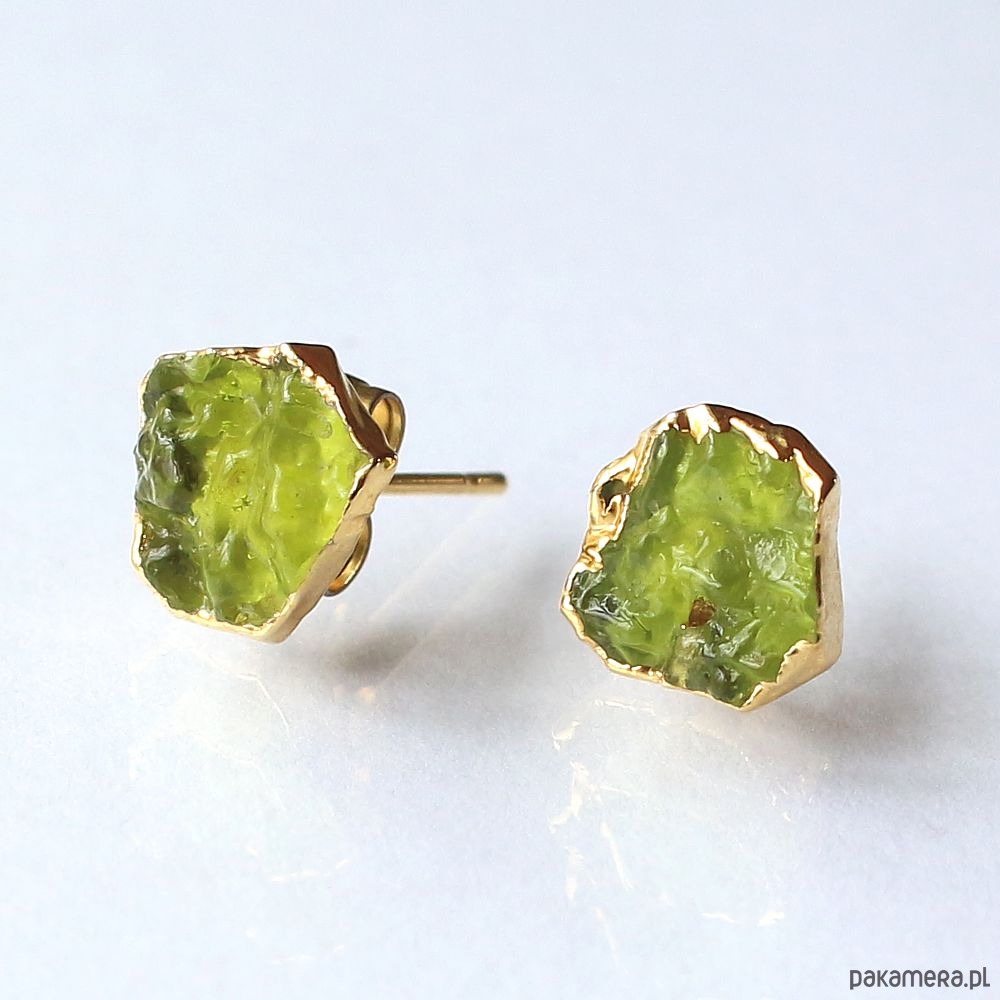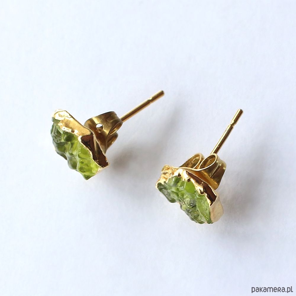 Energetyczne, filigranowe i lekkie kolczyki na sztyftach z surowymi oliwinami, ze srebra próby 925 pozłacanego 24k złotem.