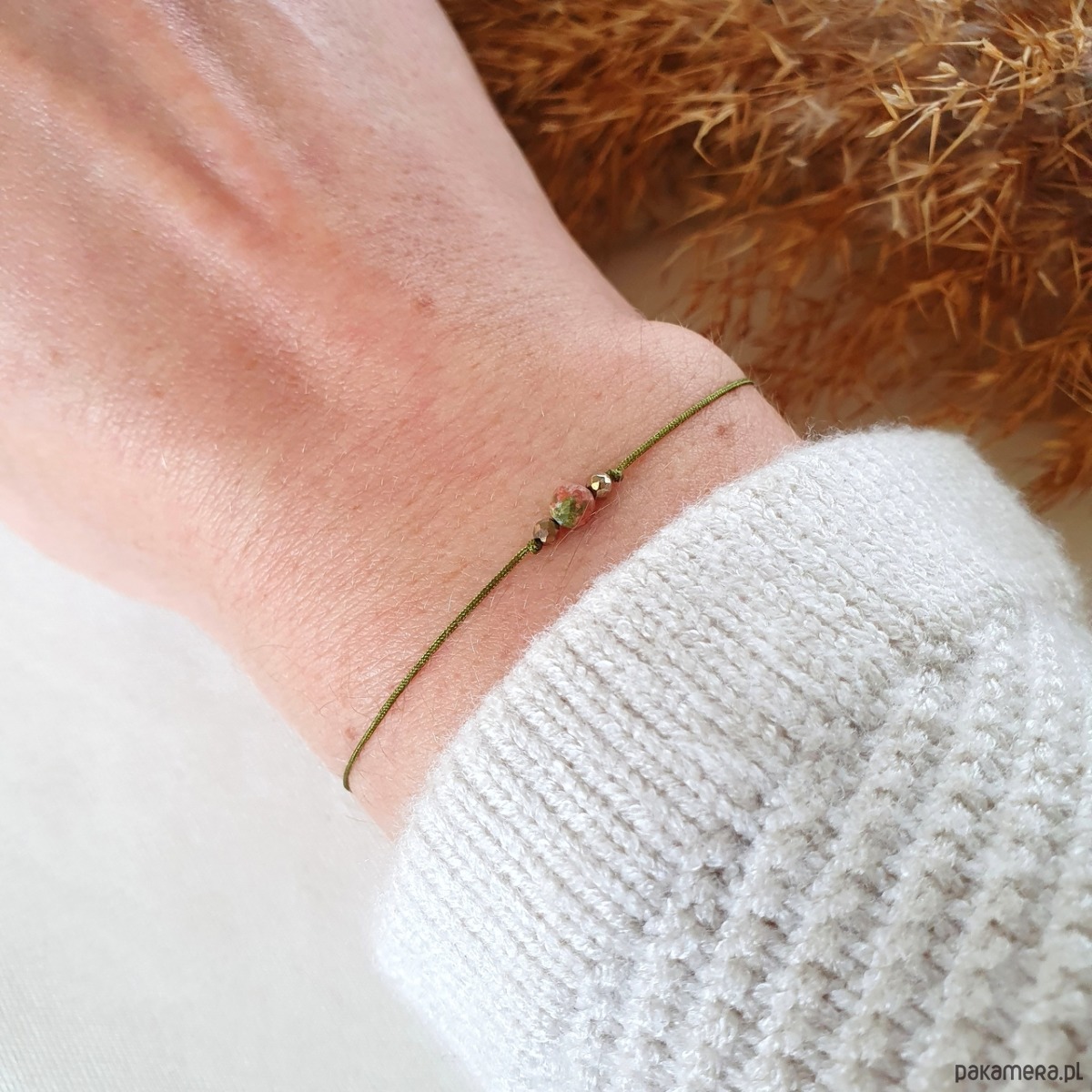 Bransoletka na wytrzymałej nitce jubilerskiej z kamieniami naturalnymi: UNAKITEM i HEMATYTEM. Regulowane zapięcie pozwala na dowolne dopasowanie do nadgarstka.