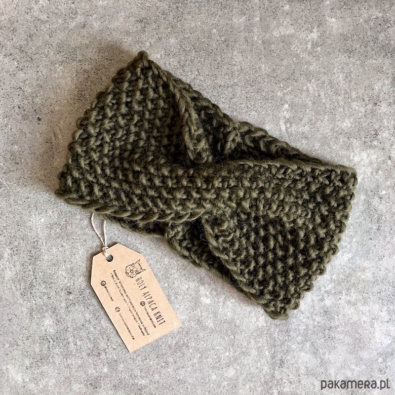 Oliwkowa wełniana opaska robiona na drutach ma kolor ciemnej oliwki. Jest miękka, wykonana z wełny peruwiańskiej owiec rasy Corriedale, czyli mieszanki z merynosem.