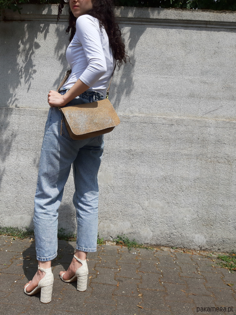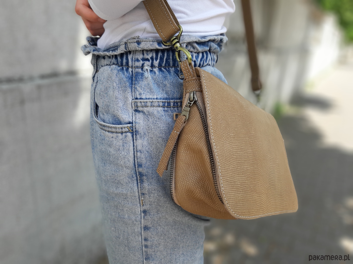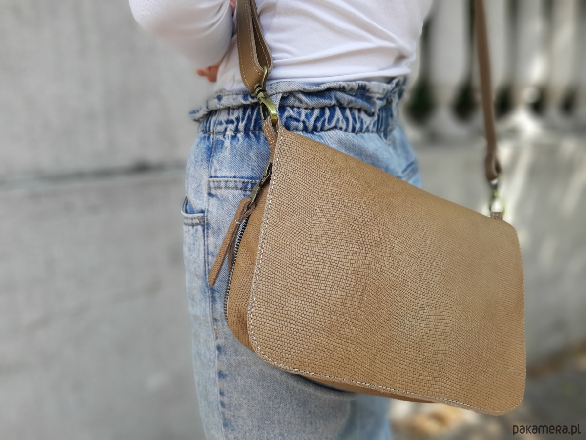Torebka zapinana jest na zamek oraz na magnes ukryty pod klapką.