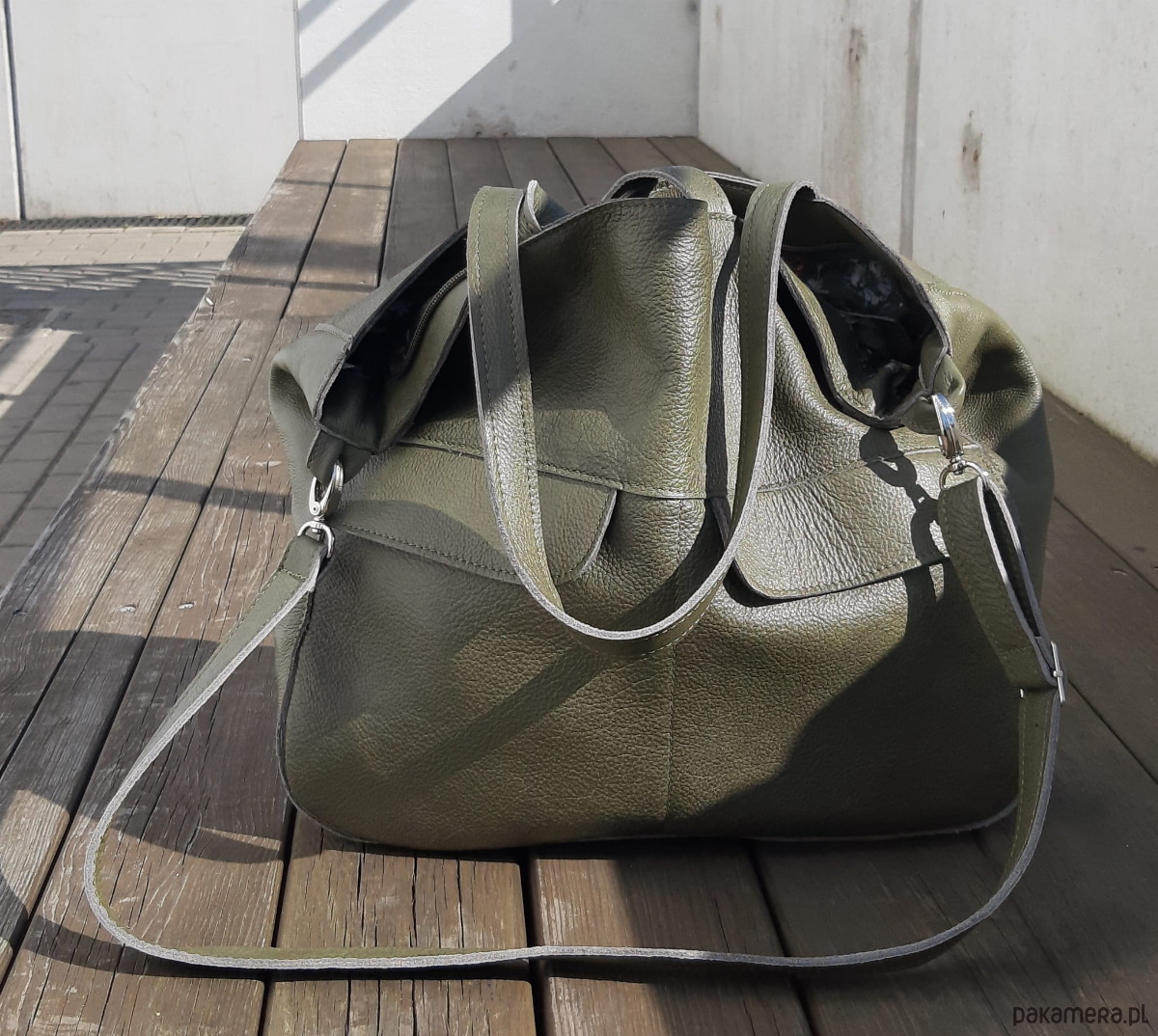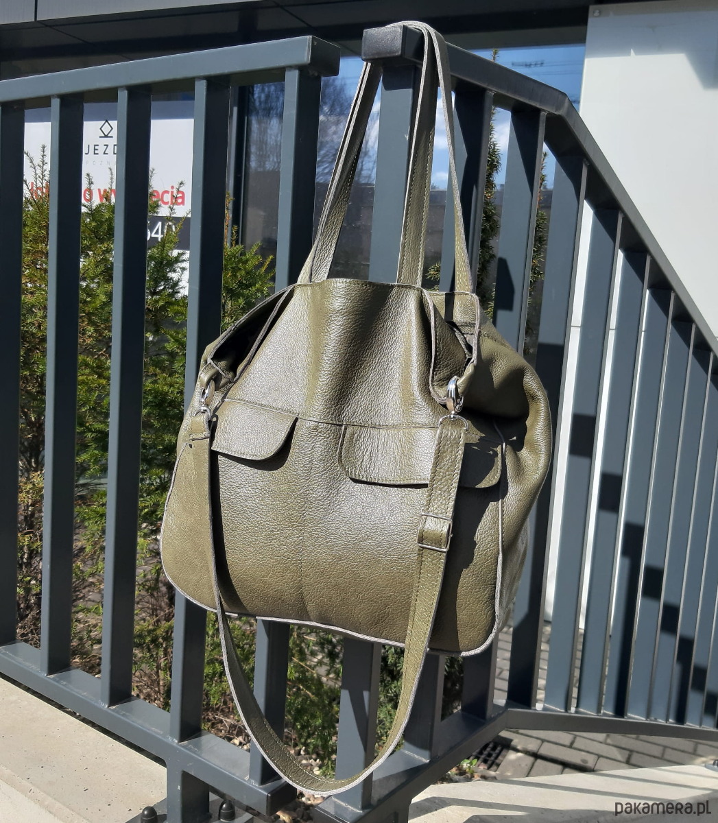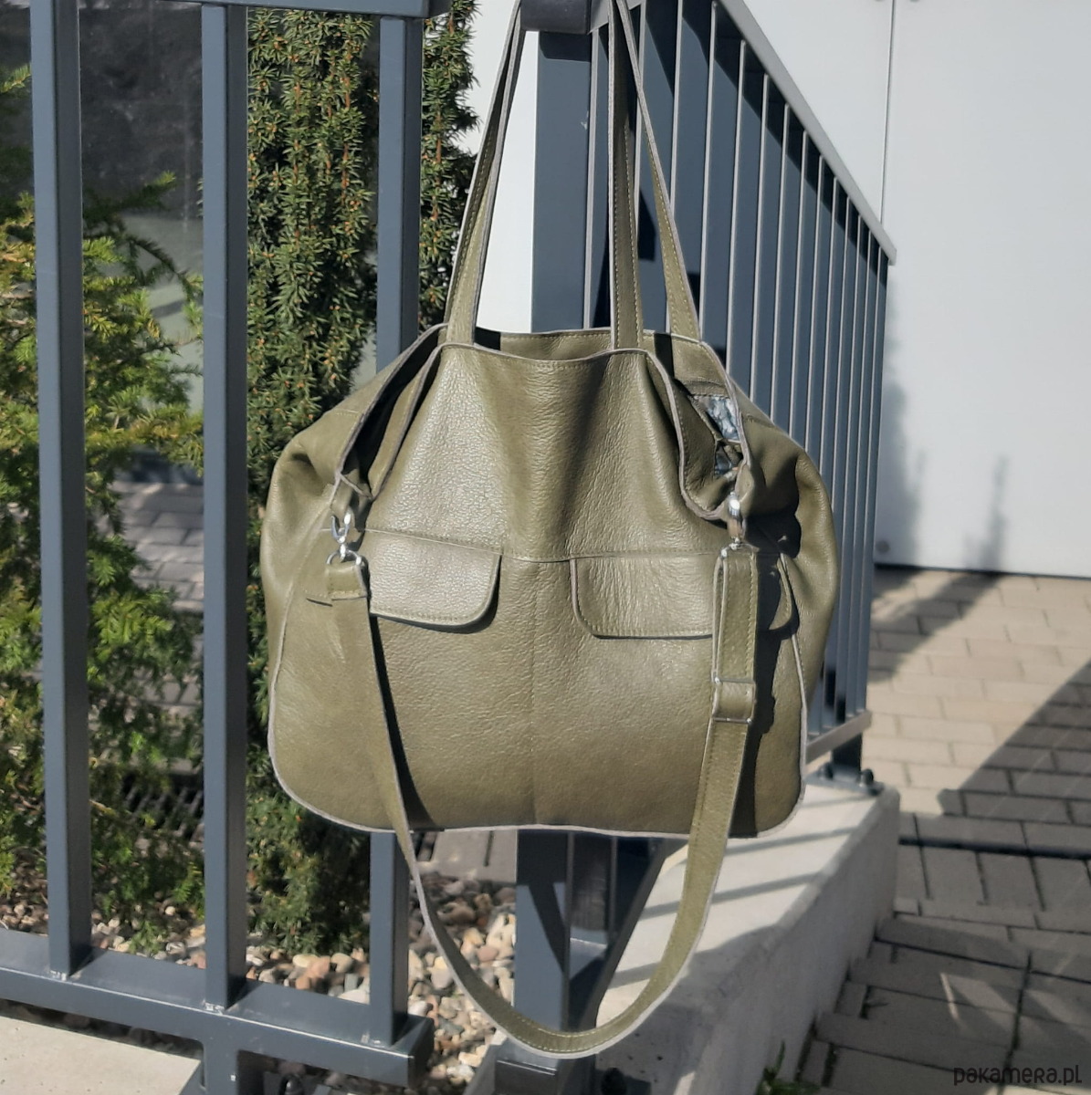 Duża, uszyta ze skóry naturalnej w kolorze zielono - oliwkowym.
