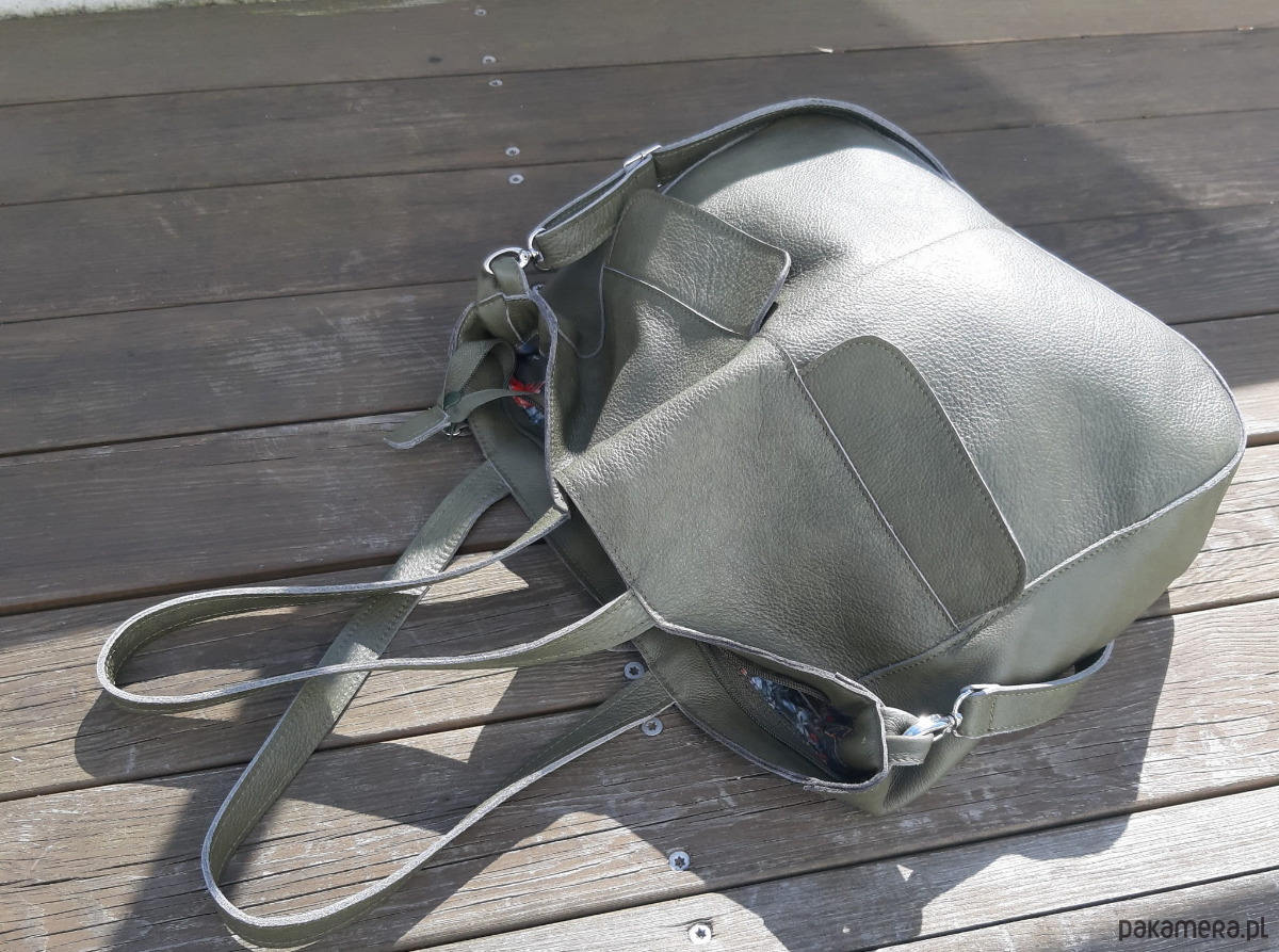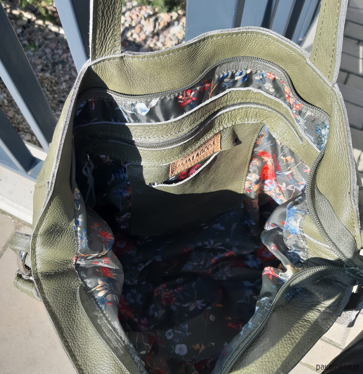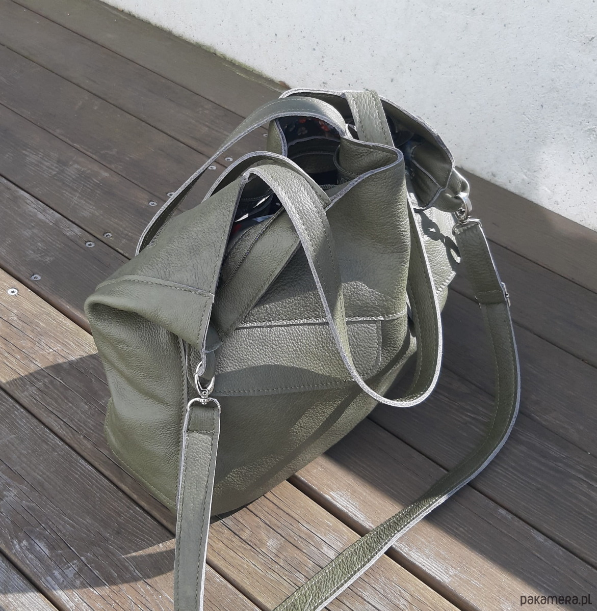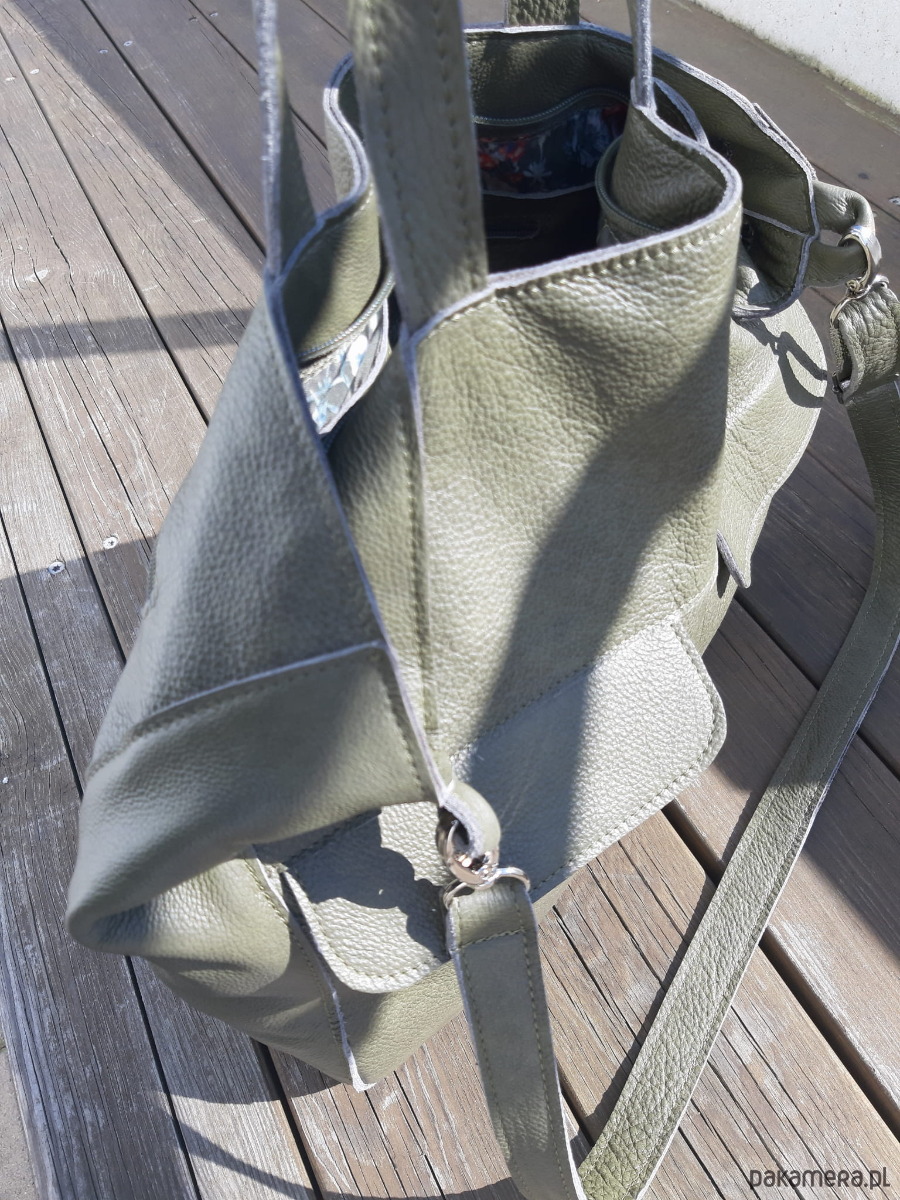 Duża, uszyta ze skóry naturalnej w kolorze zielono - oliwkowym.