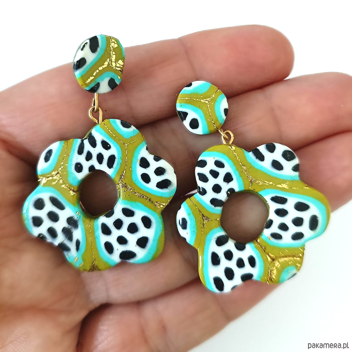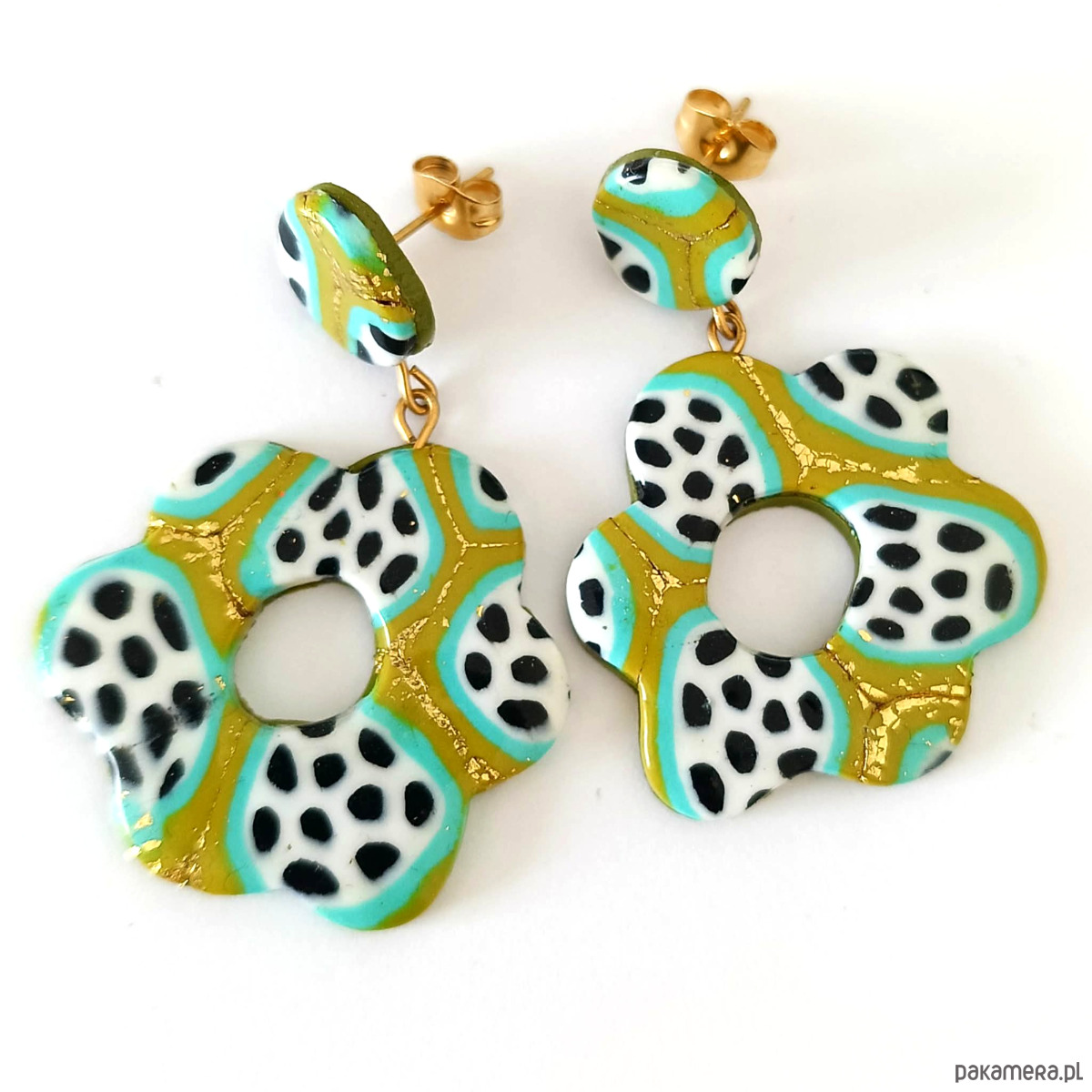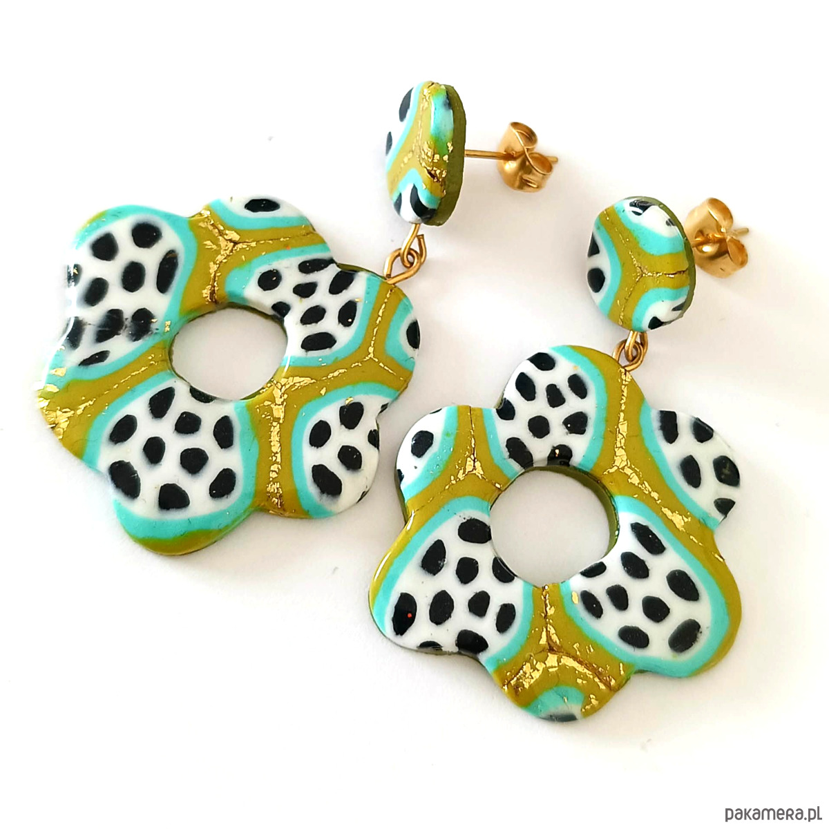 Wyraziste, ręcznie robione kolczyki w kształcie kwiatów, wykonane z lekkiej gliny polimerowej. Każda para to unikatowa kompozycja intensywnych kolorów, przełamana subtelnymi zdobieniami ze złotego płatka.