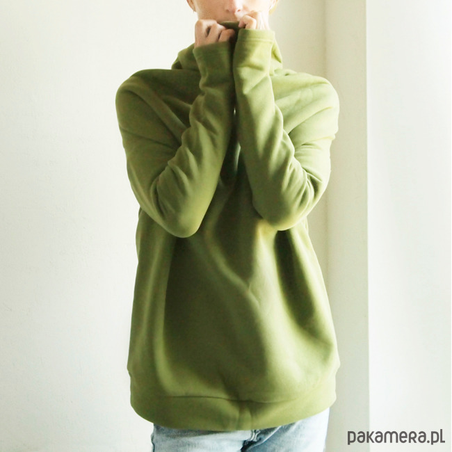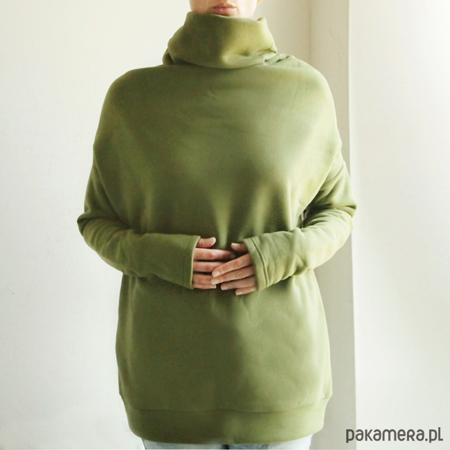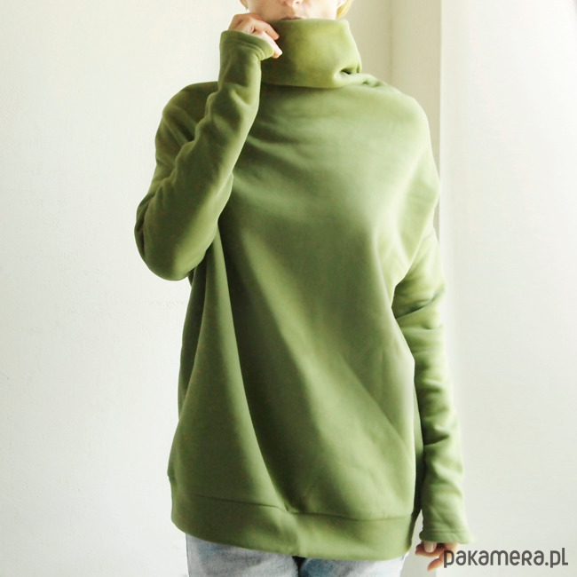 Gruba bluza o oryginalnym kroju. Tu: w kolorze oliwkowym.