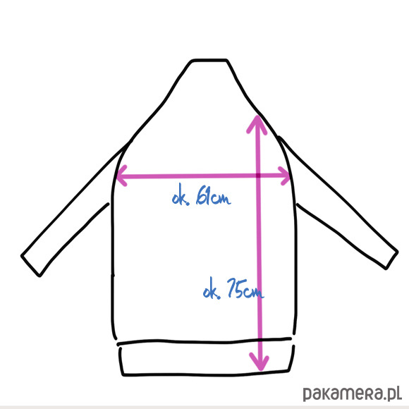 Jeden rozmiar, długość (mniej więcej od ramienia): ok. 75cm, szerokość pod pachami: ok. 61cm.