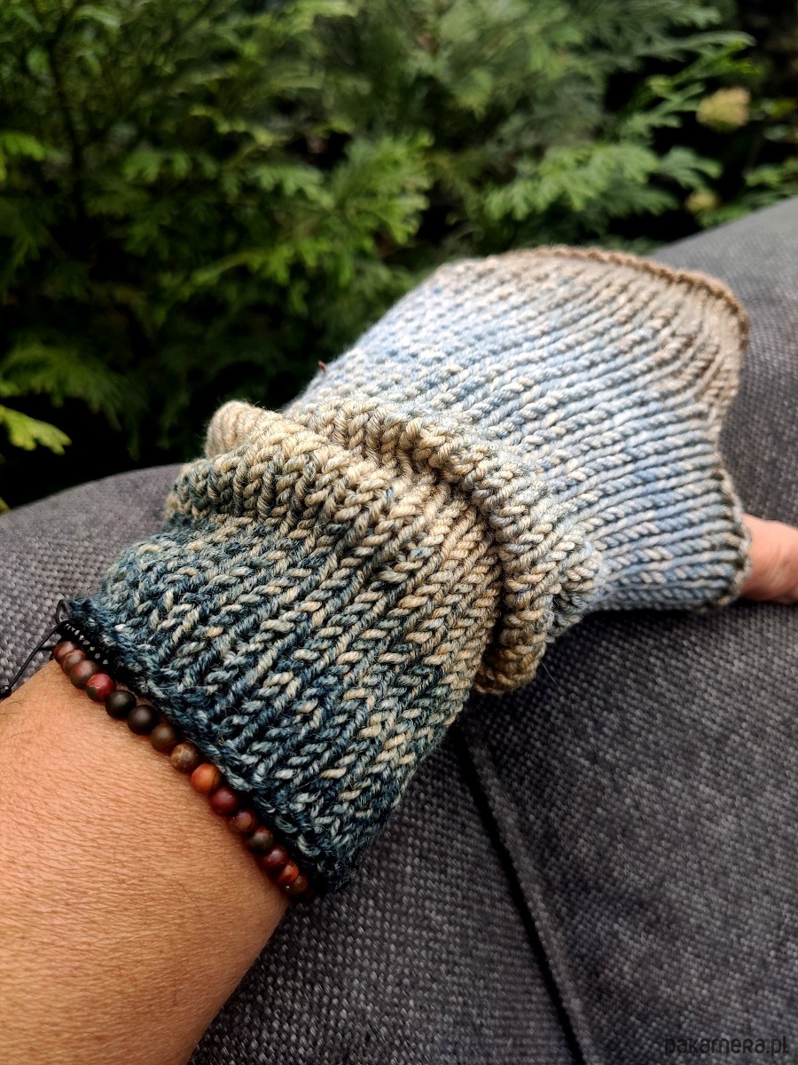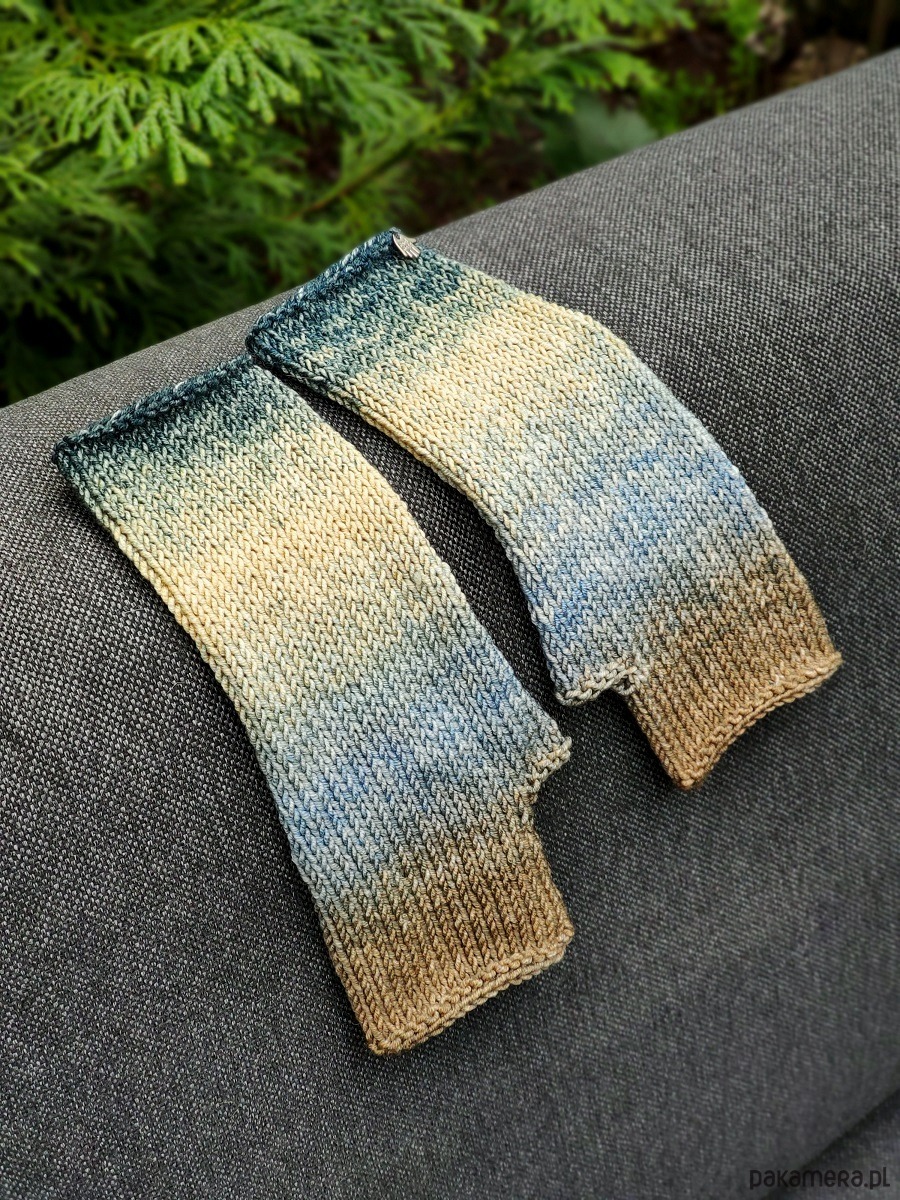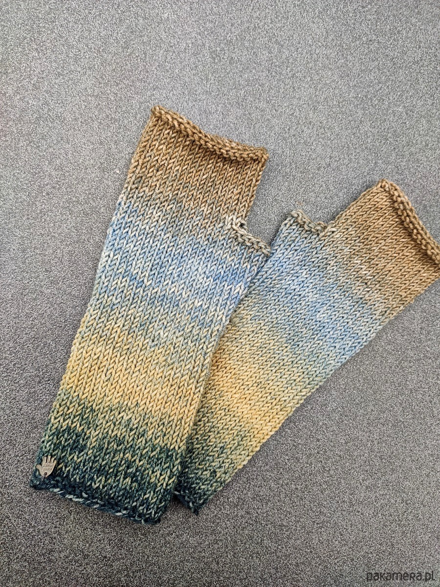 Ciepłe mitenki wykonane na drutach z wysokiej jakości włóczki w optymistycznej kolorystyce. Włóczka- to 100% wełna merino superwash, trochę sprężysta, dzięki czemu ładnie dopasowuje się do dłoni.