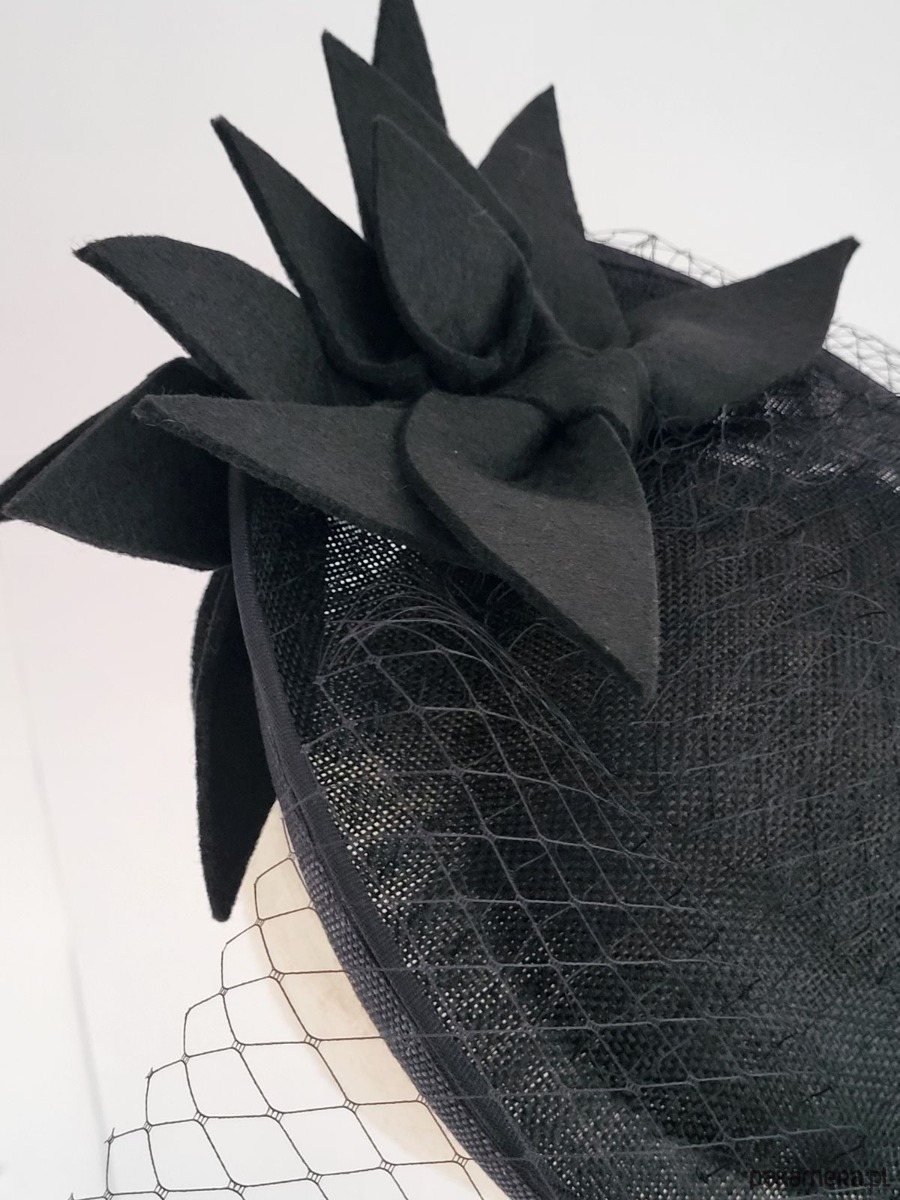 Ozdoba: Centralny punkt stanowi dynamiczna, przestrzenna aplikacja z ręcznie formowanych elementów z gładkiego filcu w kolorze czerni. Geometryczne kształty, układające się w formę przypominającą rozkwitający kwiat lub abstrakcyjne płatki, nadają toczkowi nowoczesnego, awangardowego charakteru.