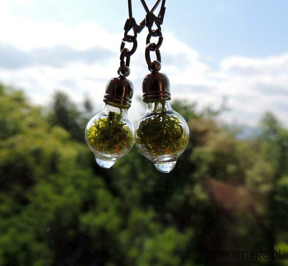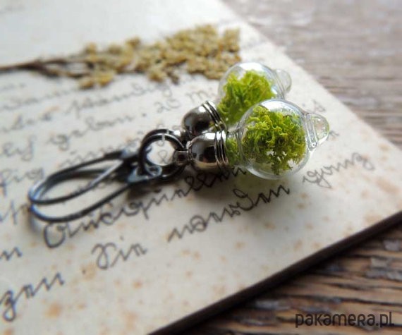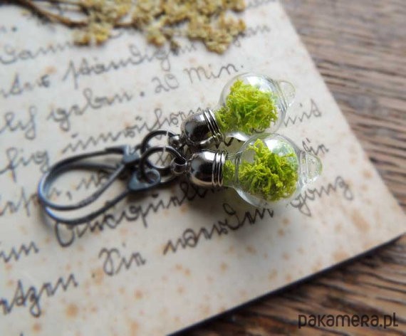 Szklane buteleczki wypełnione jasno zielonym porostem.
