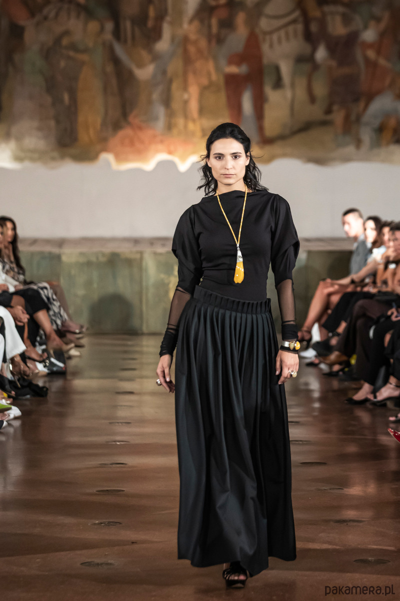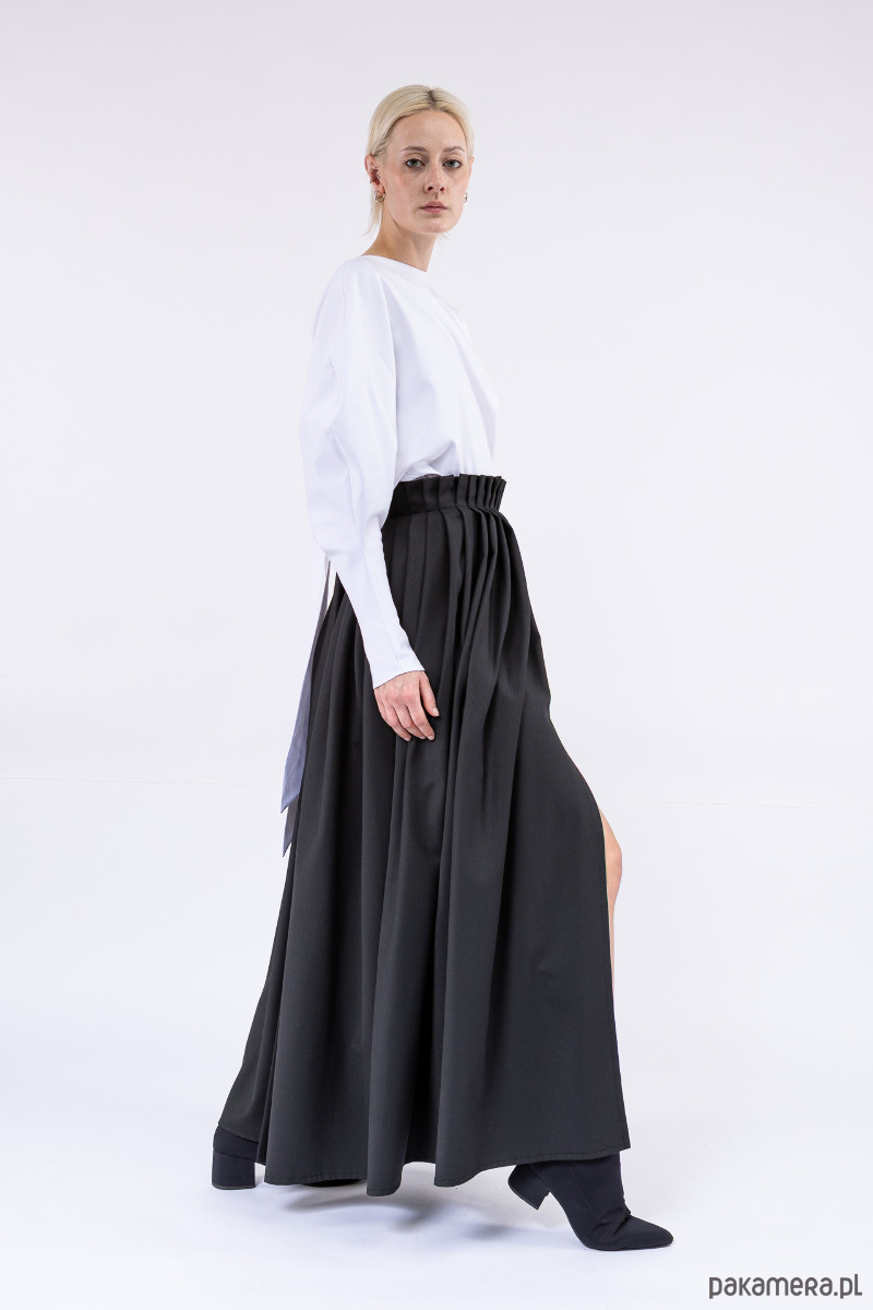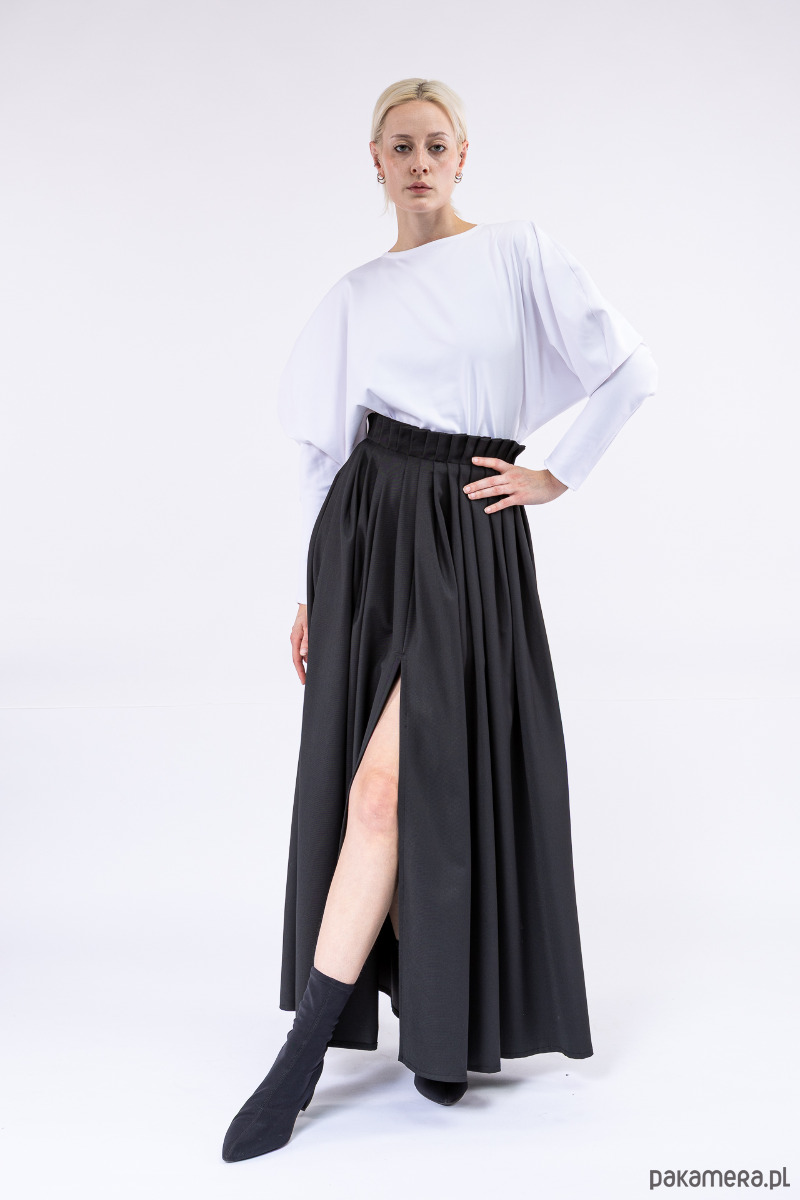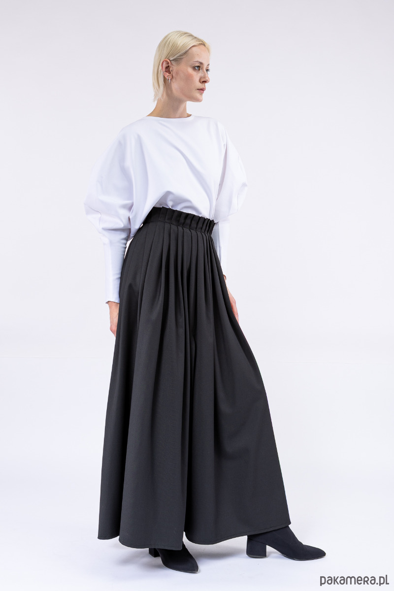 Ondina, niezwykła, szeroka, splisowana ręcznie spódnica z pęknięciami z przodu i z tyłu, z boku kryty suwak, uszyta z mieszanki lejącej i sprężystej wiskozy