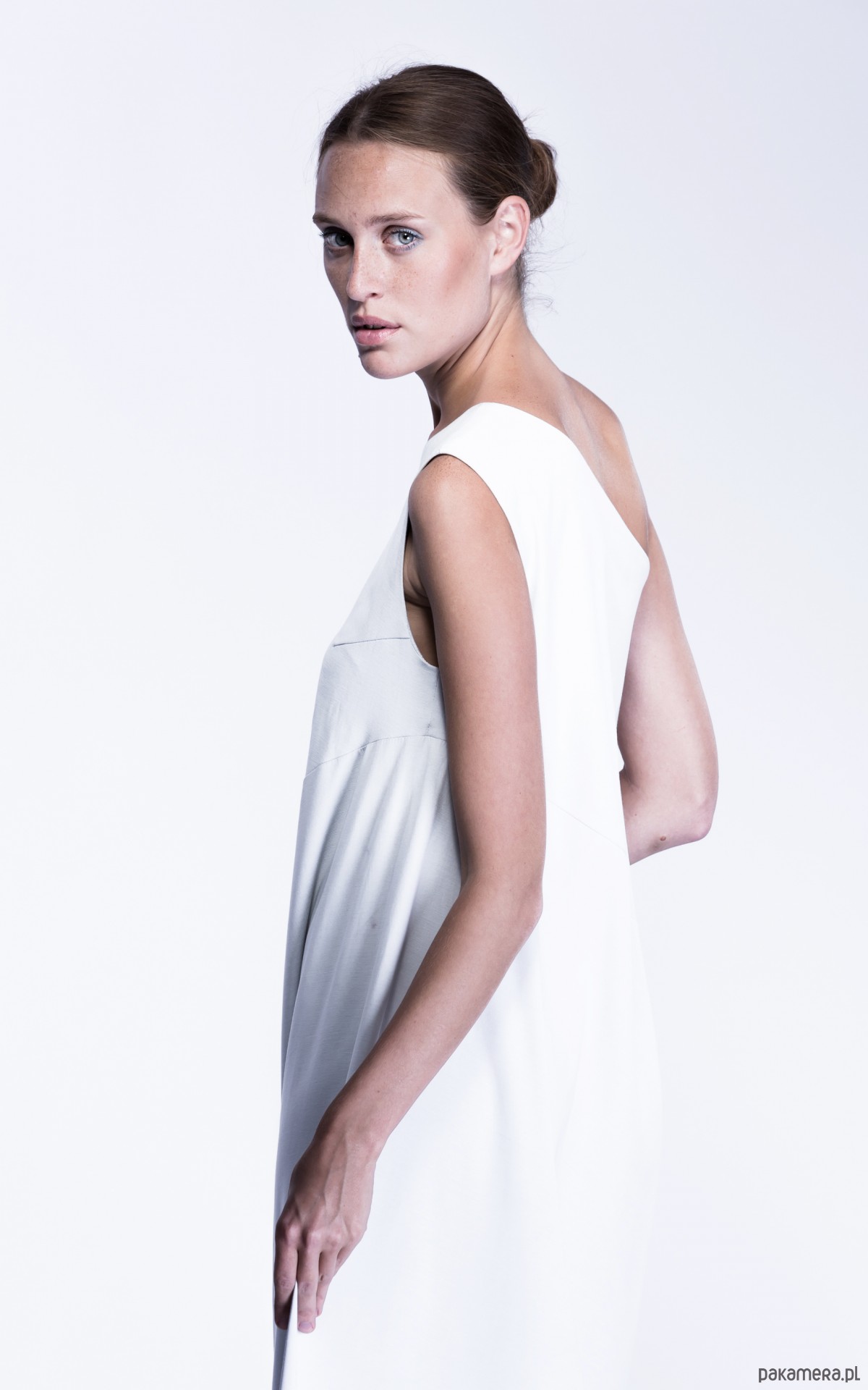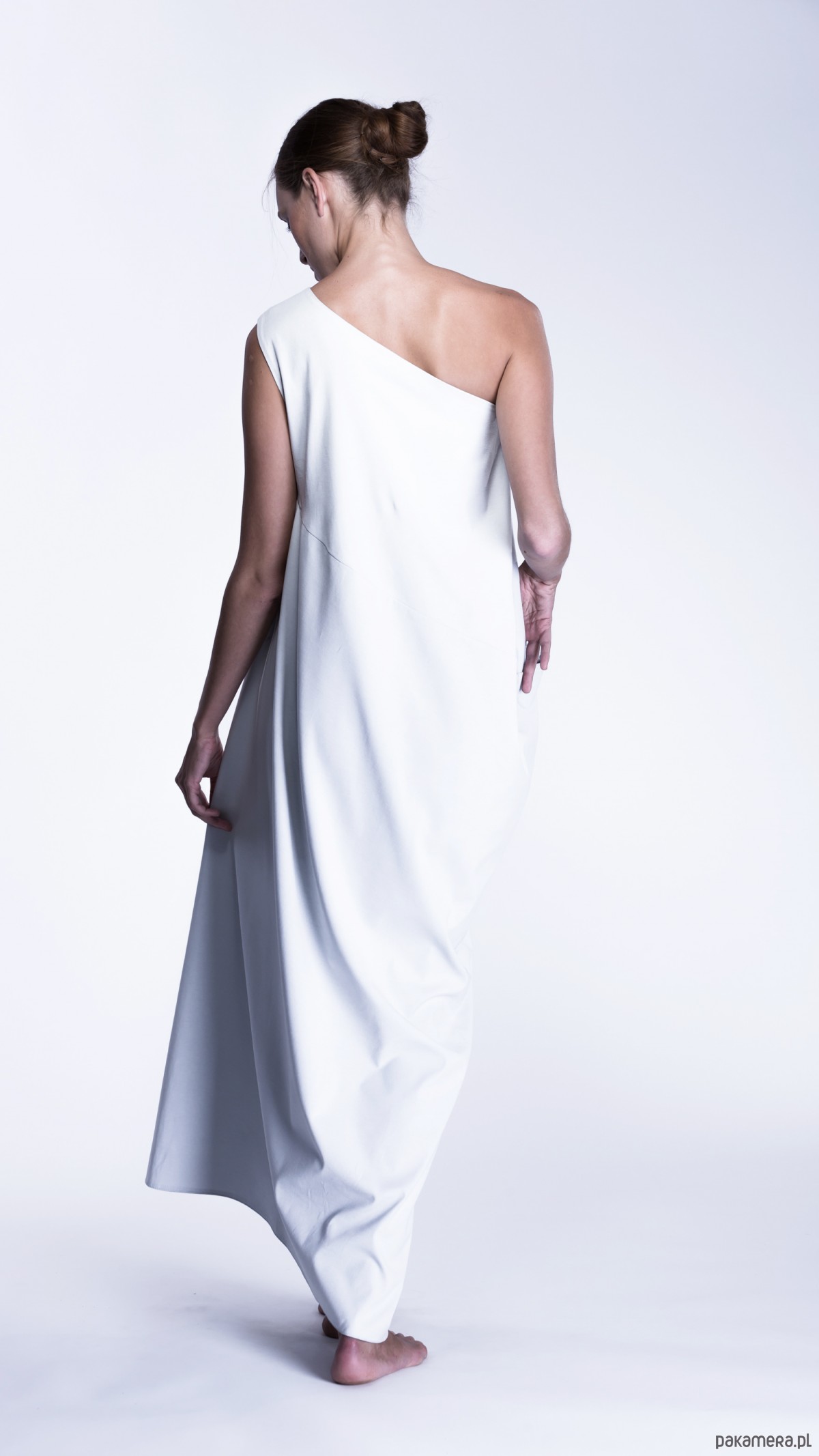 uszyta z bawełny z lycrą, lub z mieszanki wiskozy, asymetryczna, na jedno ramię, ukośna, z ozdobną kieszenią,