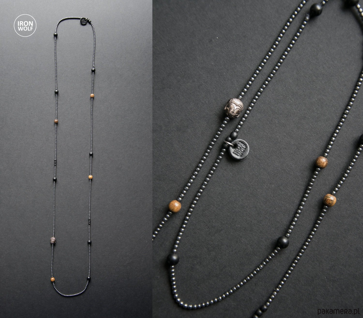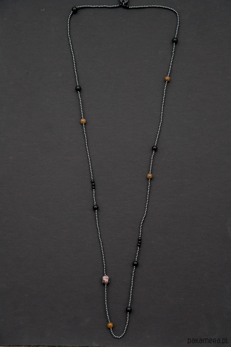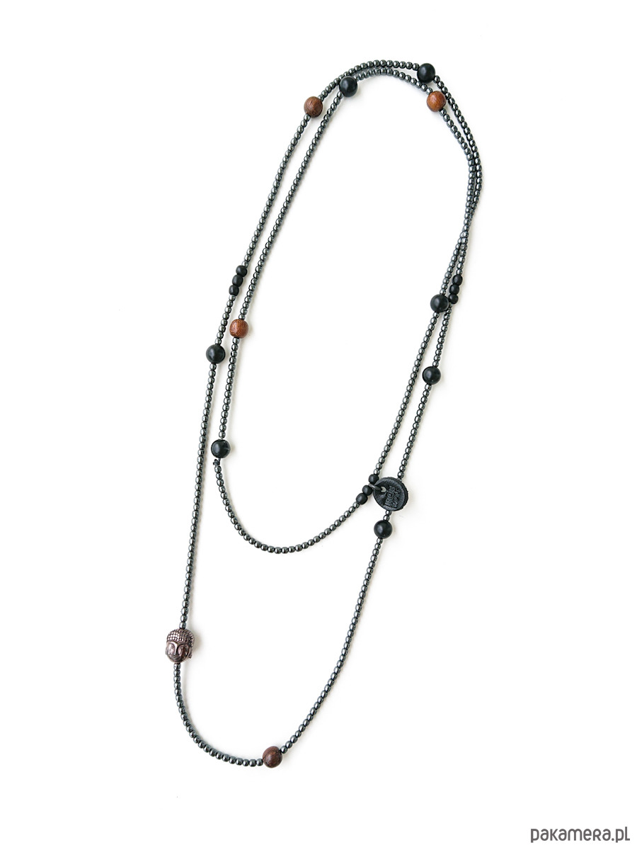 Naszyjnik z drobnego hematytu w kolorze gunmetal dopełniony kulkami matowego onyksu, egzotycznego twardego drewna robles i czarnym rogiem bawołu (małe czarne korale) . Koral z Buddą wykonany z hematytu. Naszyjnik logowany.