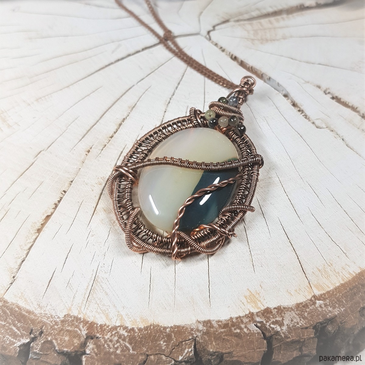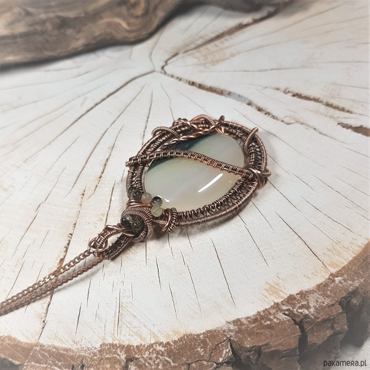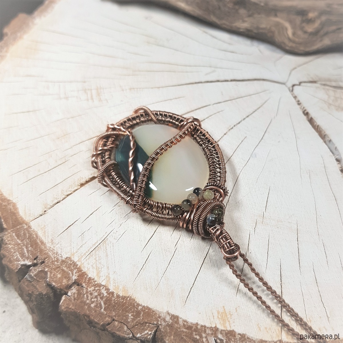 Zawieszka na łańcuszku z biało-zielonego onyksu i kolorowych kulek turmalinu. Naszyjnik zrobiony ręcznie z miedzi pracochłonną metodą wire-wrappingu, następnie oksydowany i wypolerowany w celu uzyskania efektu szlachetnego postarzenia. Wymiary wisiorka 67x40mm, zawieszony na łańcuszku standardowej długości około 50cm.
