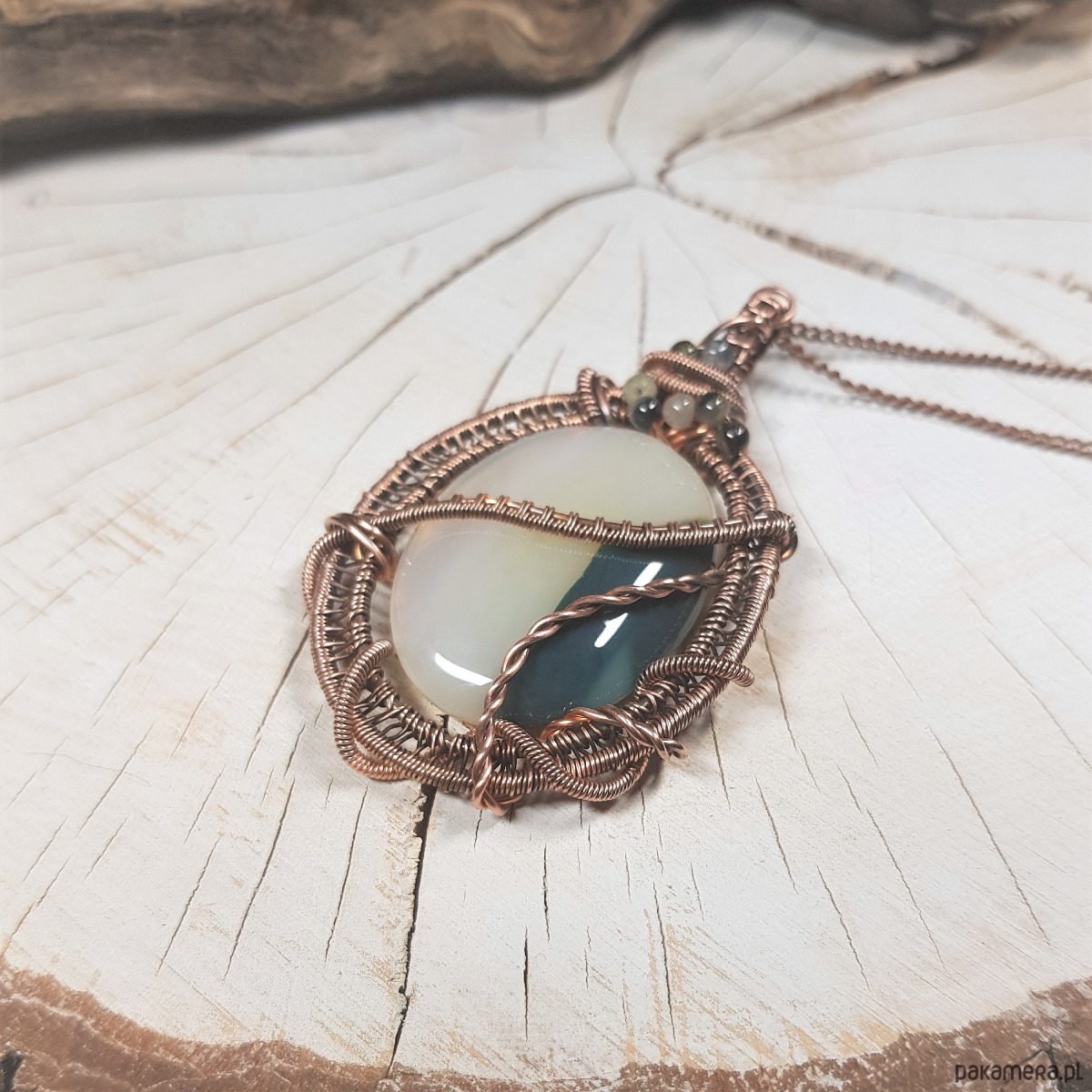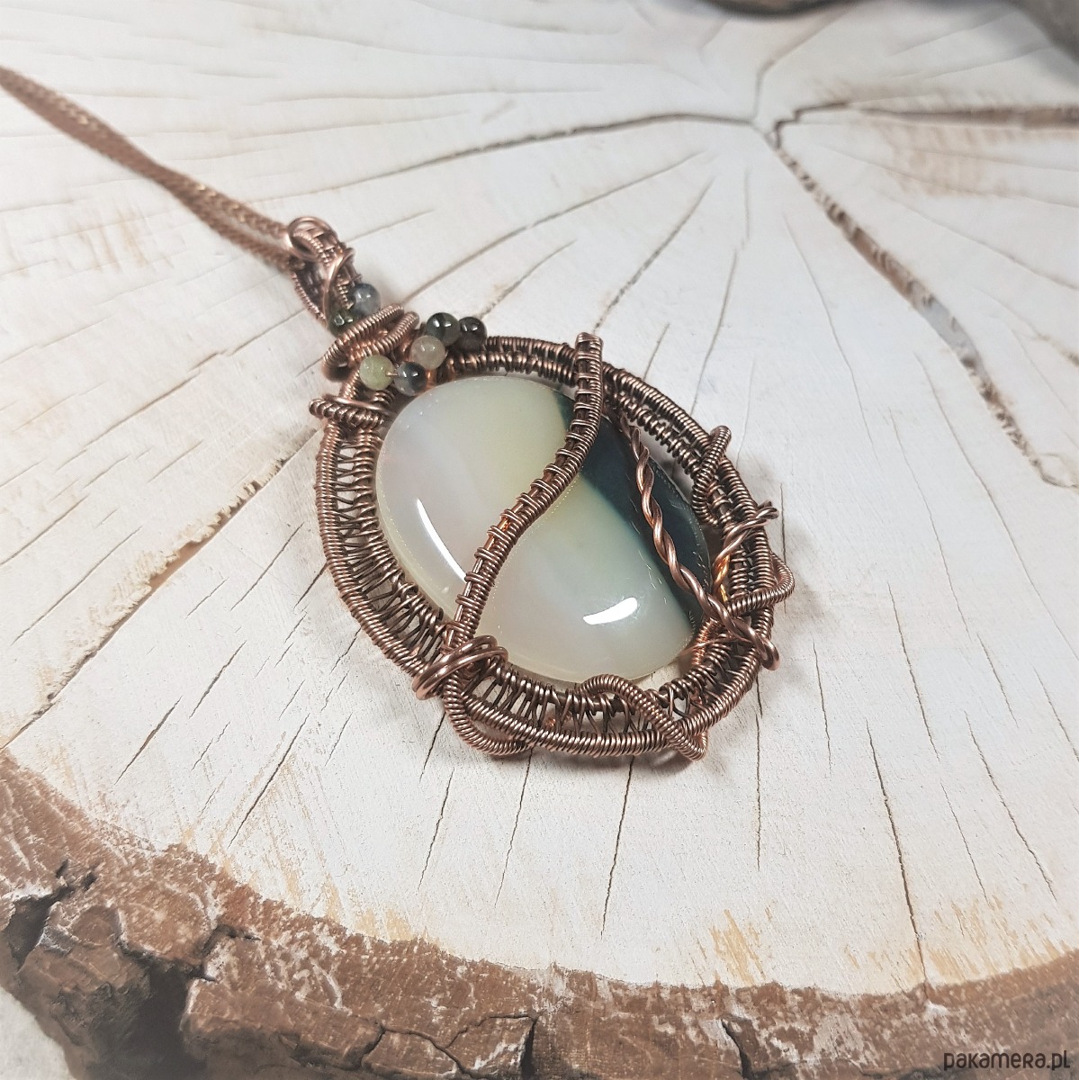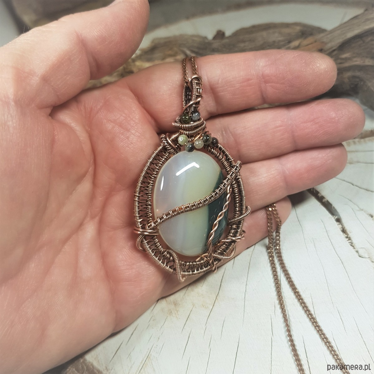 Zawieszka na łańcuszku z biało-zielonego onyksu i kolorowych kulek turmalinu. Naszyjnik zrobiony ręcznie z miedzi pracochłonną metodą wire-wrappingu, następnie oksydowany i wypolerowany w celu uzyskania efektu szlachetnego postarzenia. Wymiary wisiorka 67x40mm, zawieszony na łańcuszku standardowej długości około 50cm.