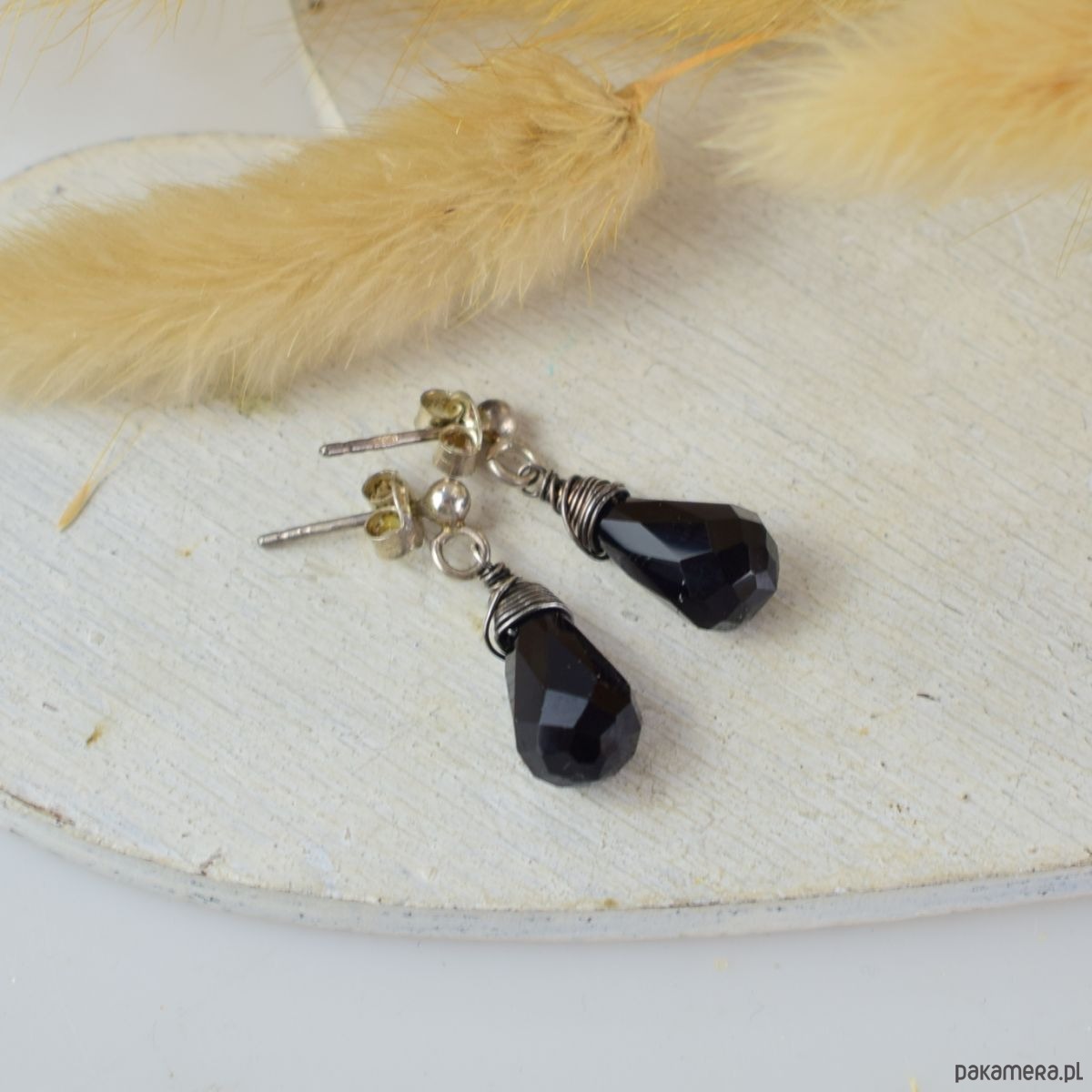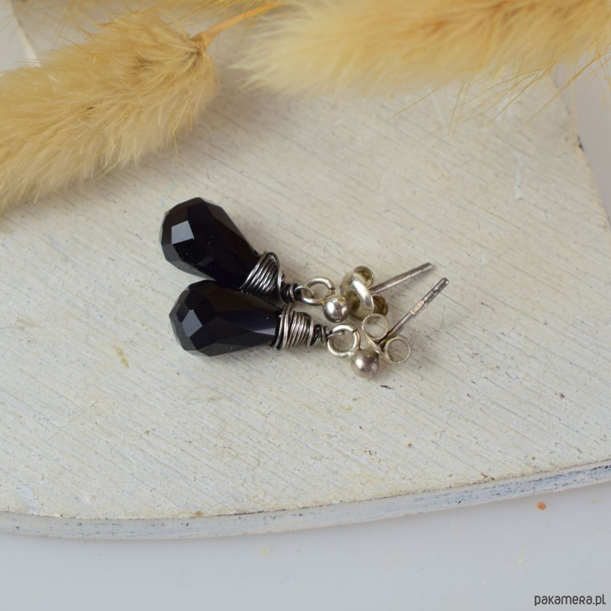 Srebrne kolczyki (srebro 925) z kroplami onyksu. Biżuteria została zoksydowana i wypolerowana. Długość całego kolczyka 2.3 cm.