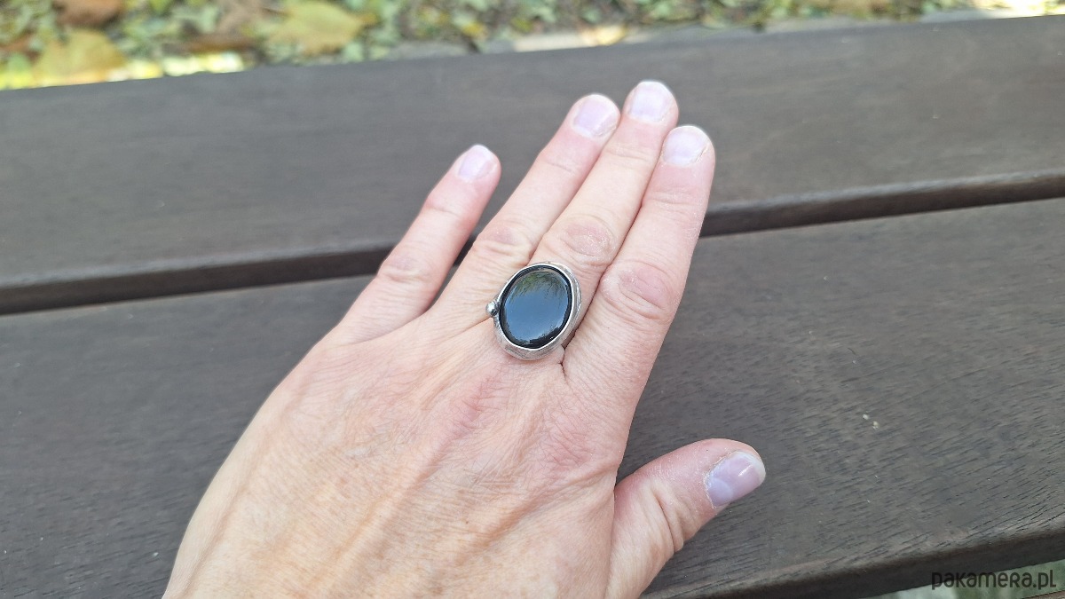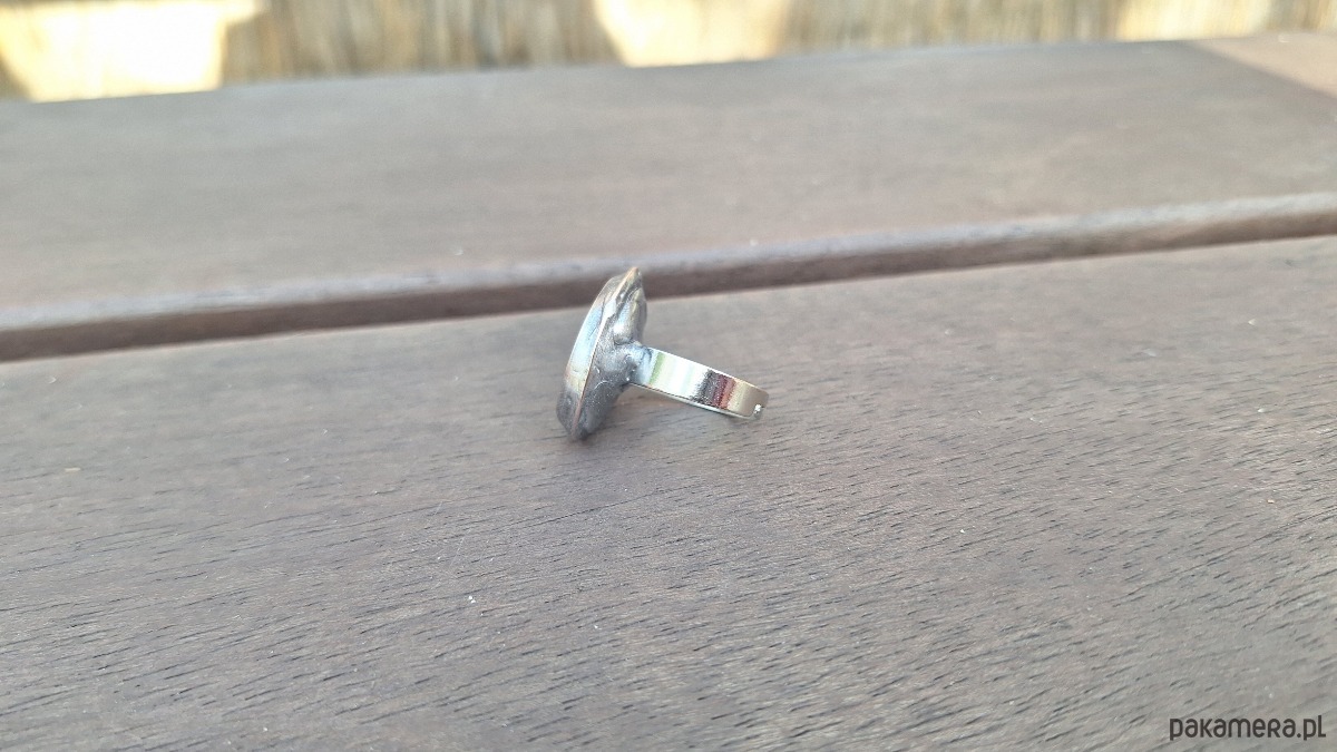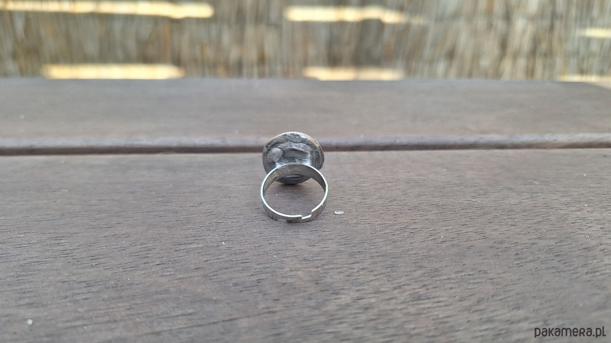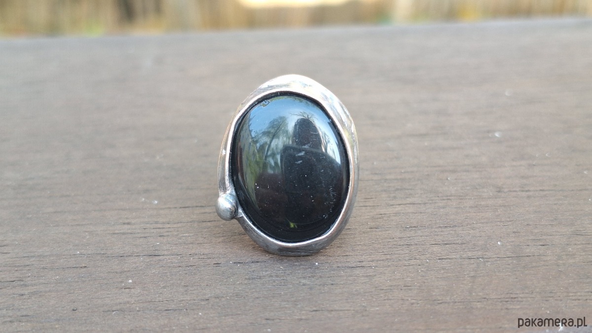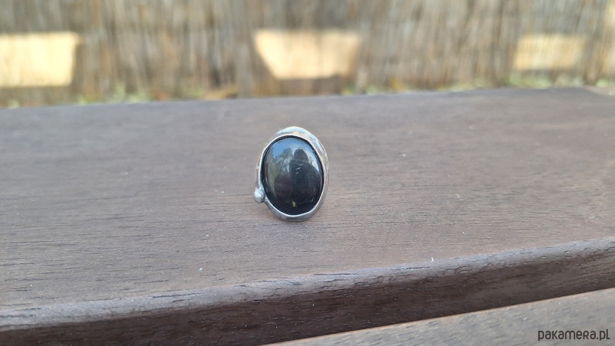 Pierścionek wykonany z miedzi, cyny i onyksu. Wymiary ok. 2.2 na 1.7 cm. Regulowany. Nie jest ciężki.