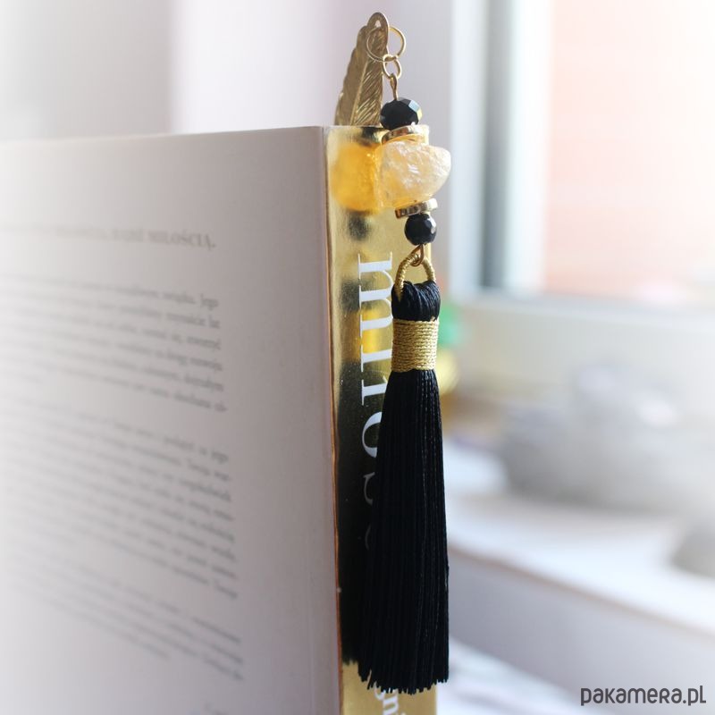 Elegancka etno zakładka do książki w odcieniu czerni, złota z fasetowanym onyksem, surowym cytrynem i pozłacanymi hematytami.