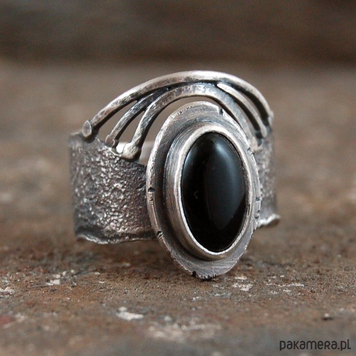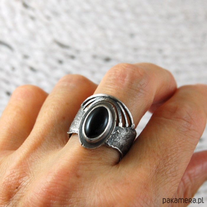 Pierścionek ze srebra i onyksu. Srebro oksydowane. Wielkość kamienia 0,6 - 1,2 cm, rozmiar regulowany. Przy zamówieniu proszę o podanie rozmiaru, pierścionek zostanie ustawiony.