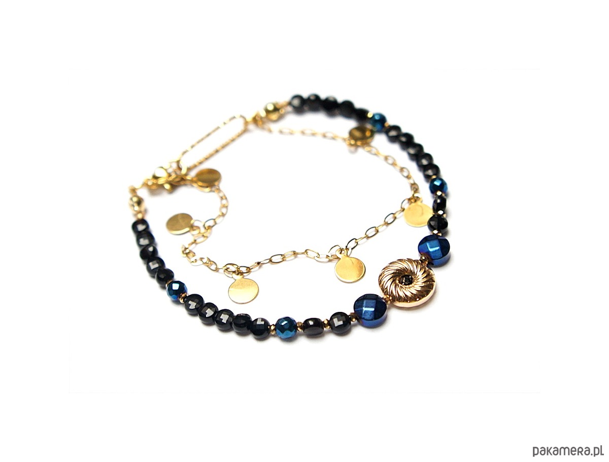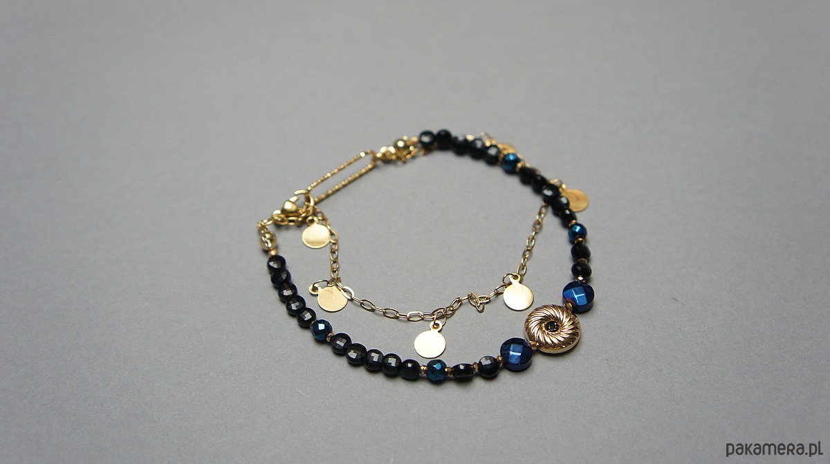 Delikatna bransoletka wykonana w całości ze stali szlachetnej pozłacanej oraz naturalnych, szlachetnych kamieni - fasetowane monetki onyksu [śr. 4mm], fasetowane kuleczki hematytu [4mm], fasetowane monetki hematytu [6mm], spinel fasetowany [2mm], złotego okręgu z hematytu [9mm] oraz przekładek z hematytu [1mm]. Całkowita długość bransoletki: ok. 19,3cm. Na życzenie możemy pomniejszyć lub powiększyć bransoletkę - wcześniej prosimy o kontakt.