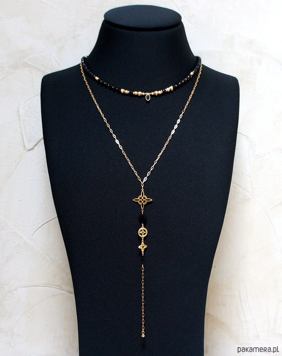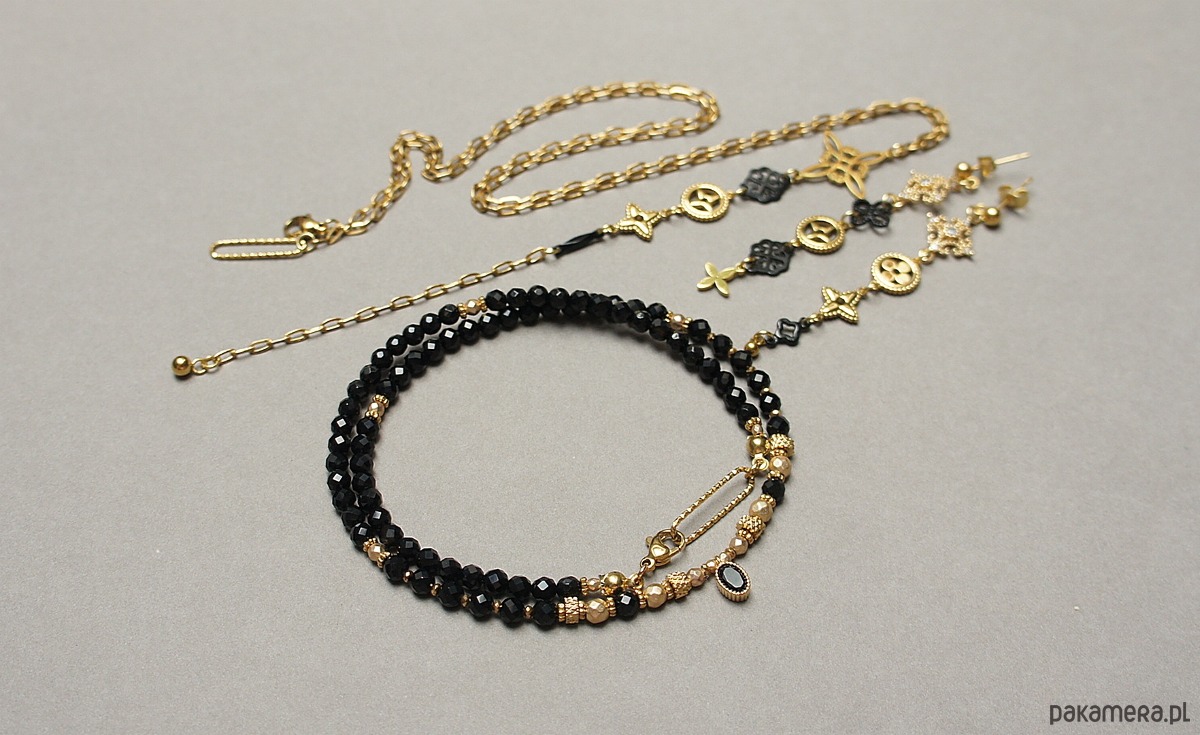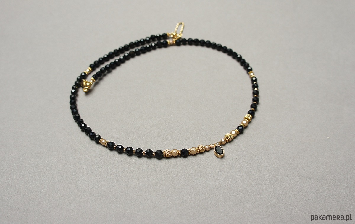 Krótki naszyjnik wykonany w całości z pozłacanej stali szlachetnej oraz kamieni naturalnych - onyks fasetowany [3,5mm], hematyt fasetowany, platerowany [2mm, 3mm i 4mm], przekładek z hematytu [1mm] oraz zawieszki z cyrkonią w okuciu. Naszyjnik o długości ok. 42cm.