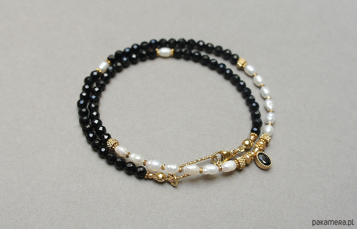 Krótki naszyjnik wykonany w całości z pozłacanej stali szlachetnej oraz kamieni naturalnych - onyks fasetowany [3,5mm], perły naturalne słodkowodne [ok. 6mm], hematyt fasetowany, platerowany [2mm, 3 x 2mm], przekładek z hematytu [1mm] oraz zawieszki z cyrkonią w okuciu. Naszyjnik o długości ok. 41cm.