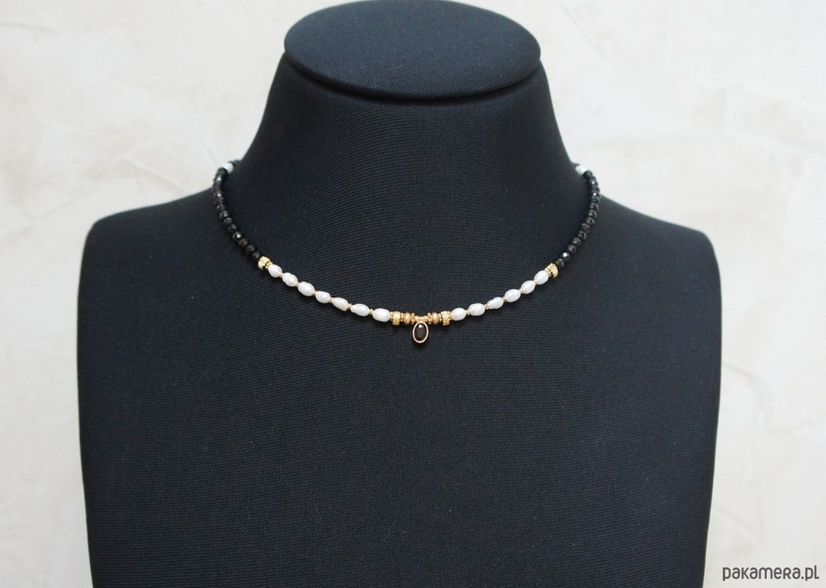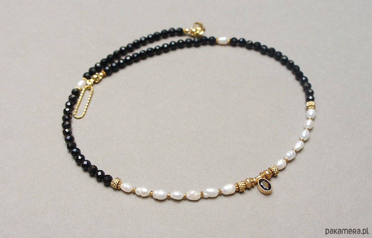 Krótki naszyjnik wykonany w całości z pozłacanej stali szlachetnej oraz kamieni naturalnych - onyks fasetowany [3,5mm], perły naturalne słodkowodne [ok. 6mm], hematyt fasetowany, platerowany [2mm, 3 x 2mm], przekładek z hematytu [1mm] oraz zawieszki z cyrkonią w okuciu. Naszyjnik o długości ok. 41cm.