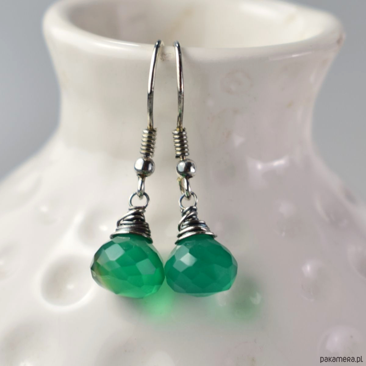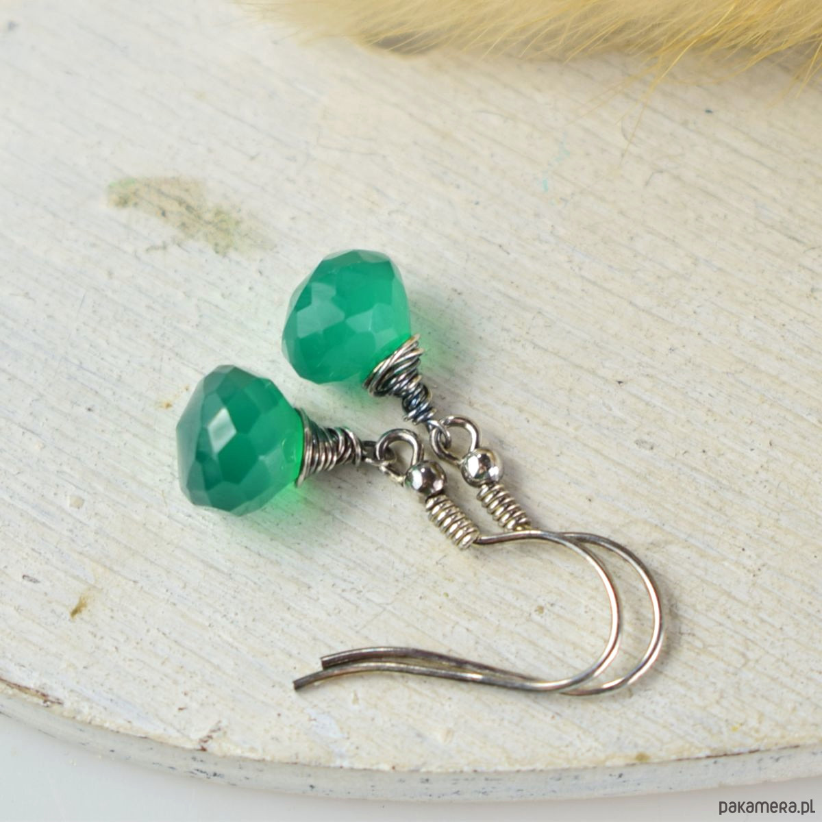 Srebrne kolczyki (srebro 925) z kroplami onyksu zielonego. Biżuteria została zoksydowana i wypolerowana. Długość całego kolczyka 3 cm.